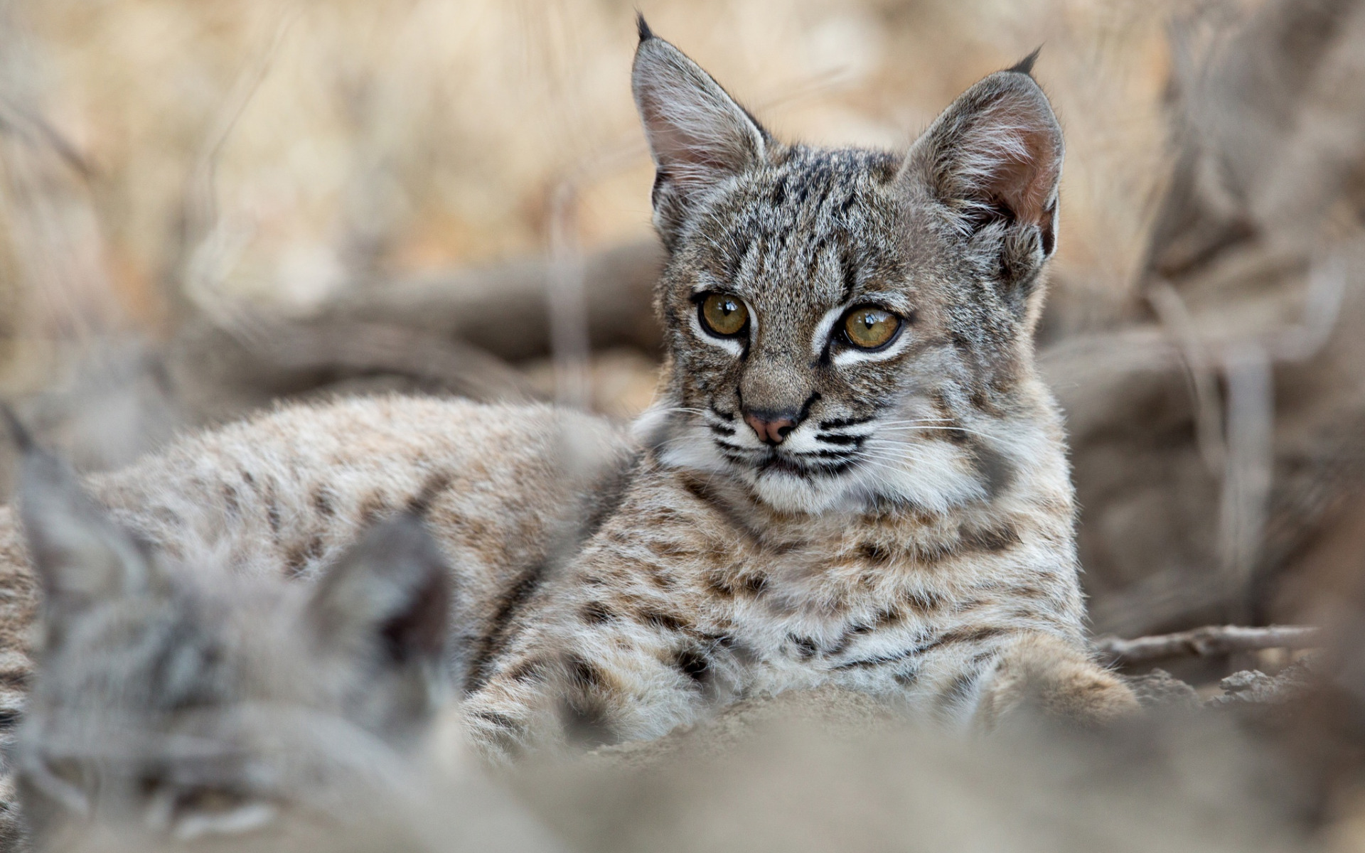 Description: A cat is sitting in the grass looking at the camera with a blurry background of grass and bushes.
