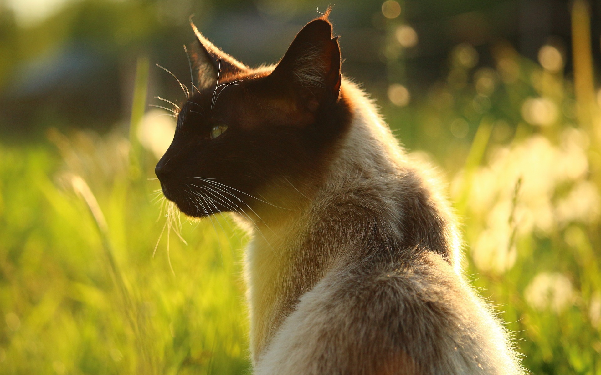 Description: A cat sitting in the grass looking off into the distance with a blurry background of grass and flowers.