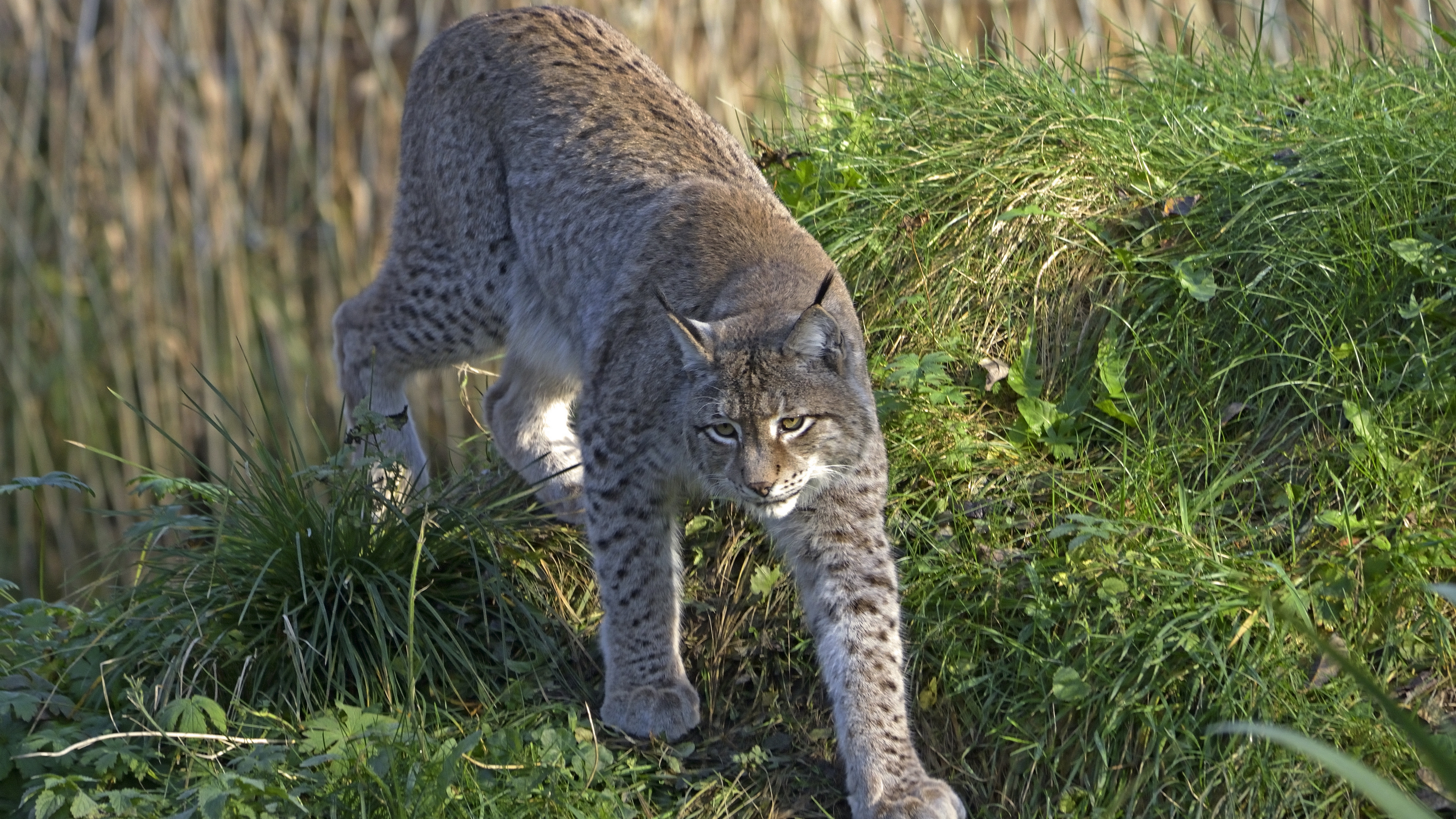 Description: A cat walking through a grassy area next to a fence and bushes and grass covered ground with tall grasses.