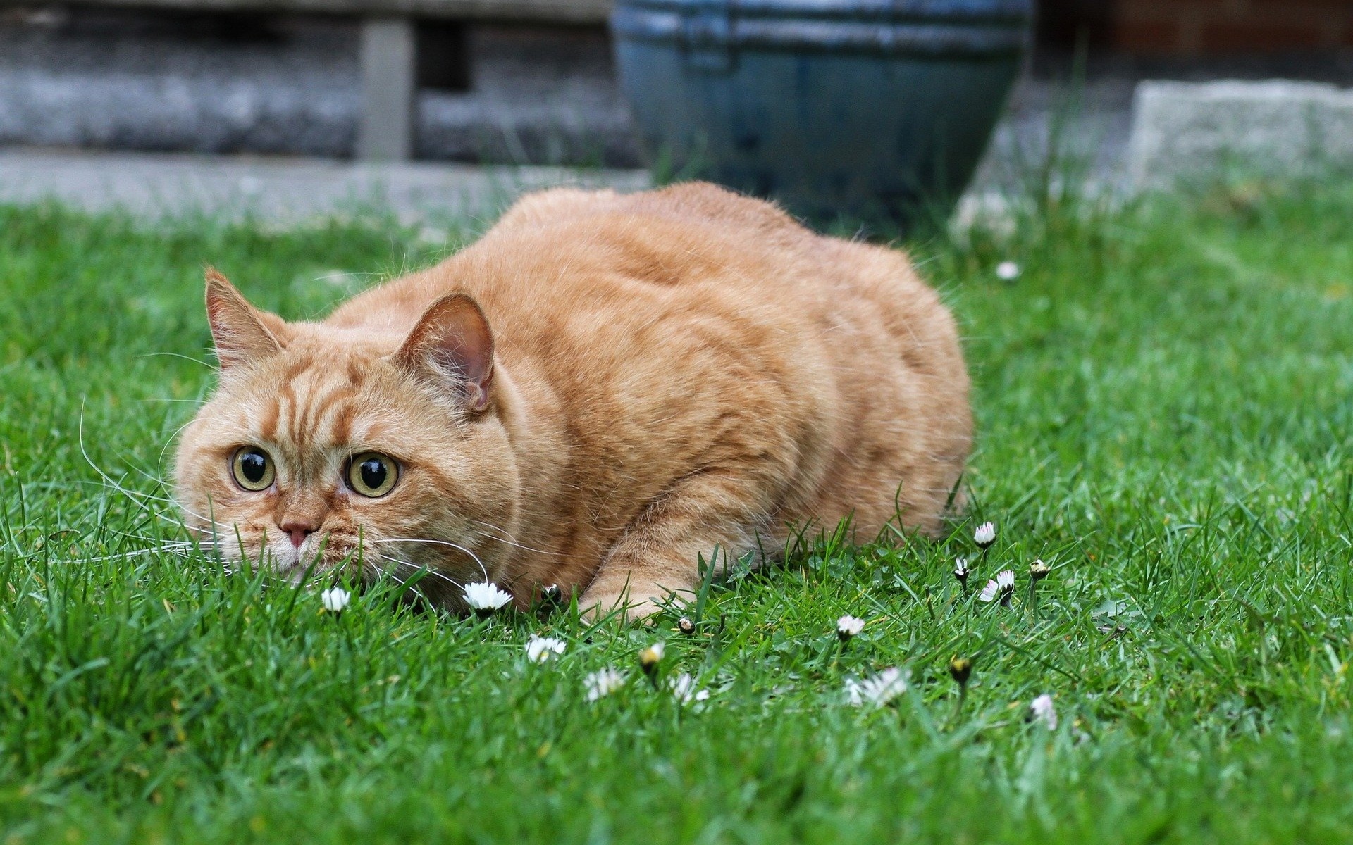Description: A cat laying in the grass with a flower in its mouth and a blue pot behind it on the ground.