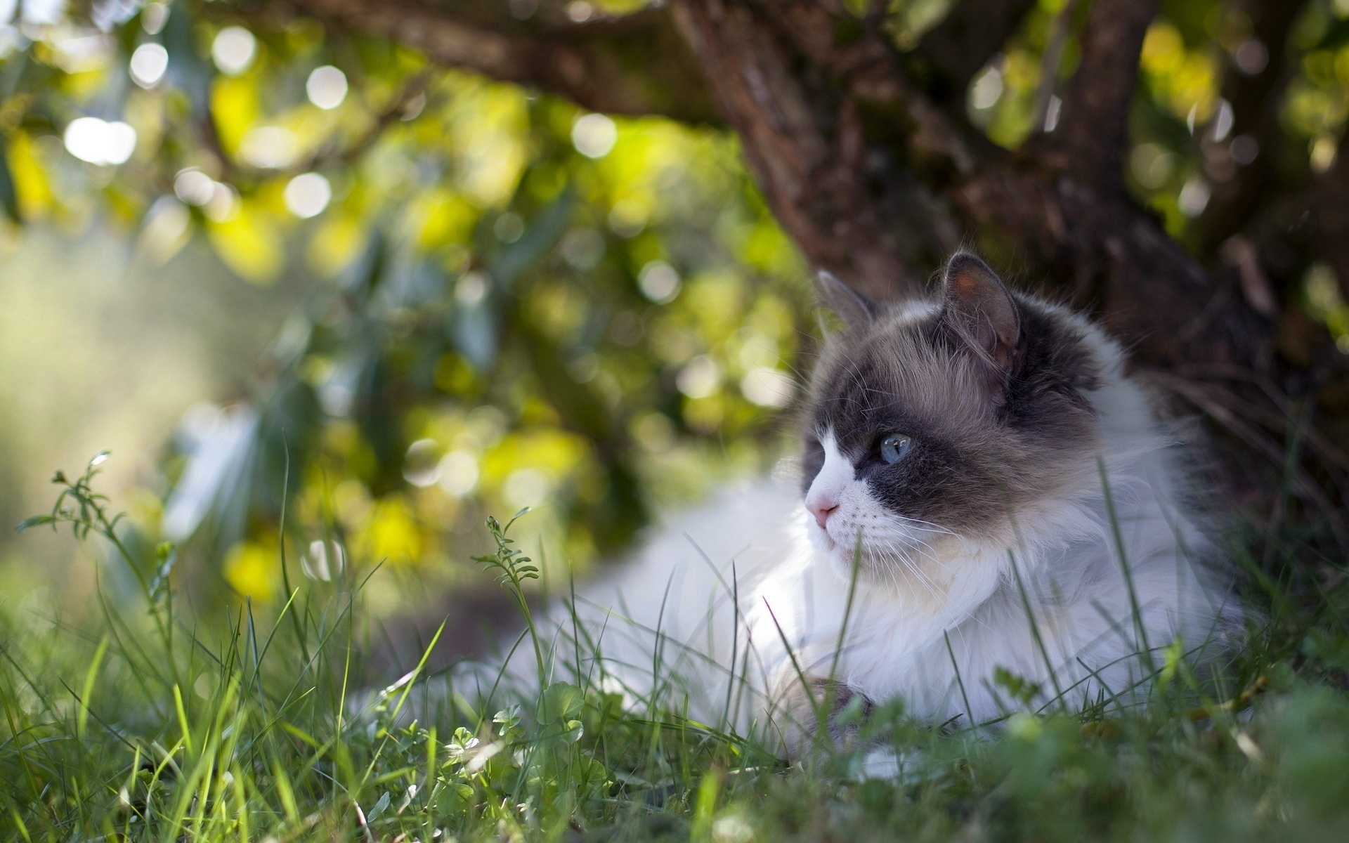 Description: A cat laying in the grass under a tree in the shade of a tree branch with green leaves on it.