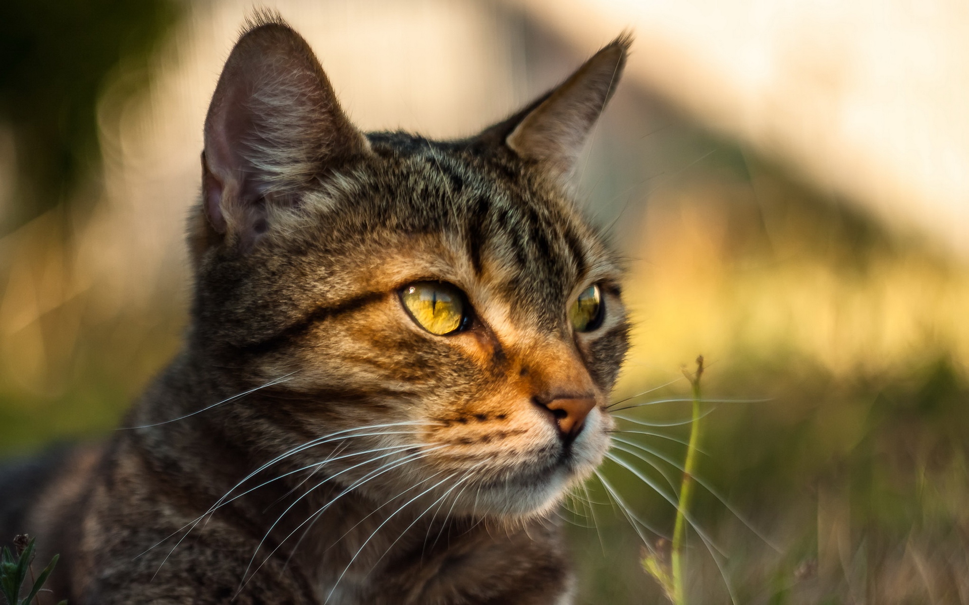 Description: A cat is sitting in the grass looking at something with a blurry background of grass and a building.