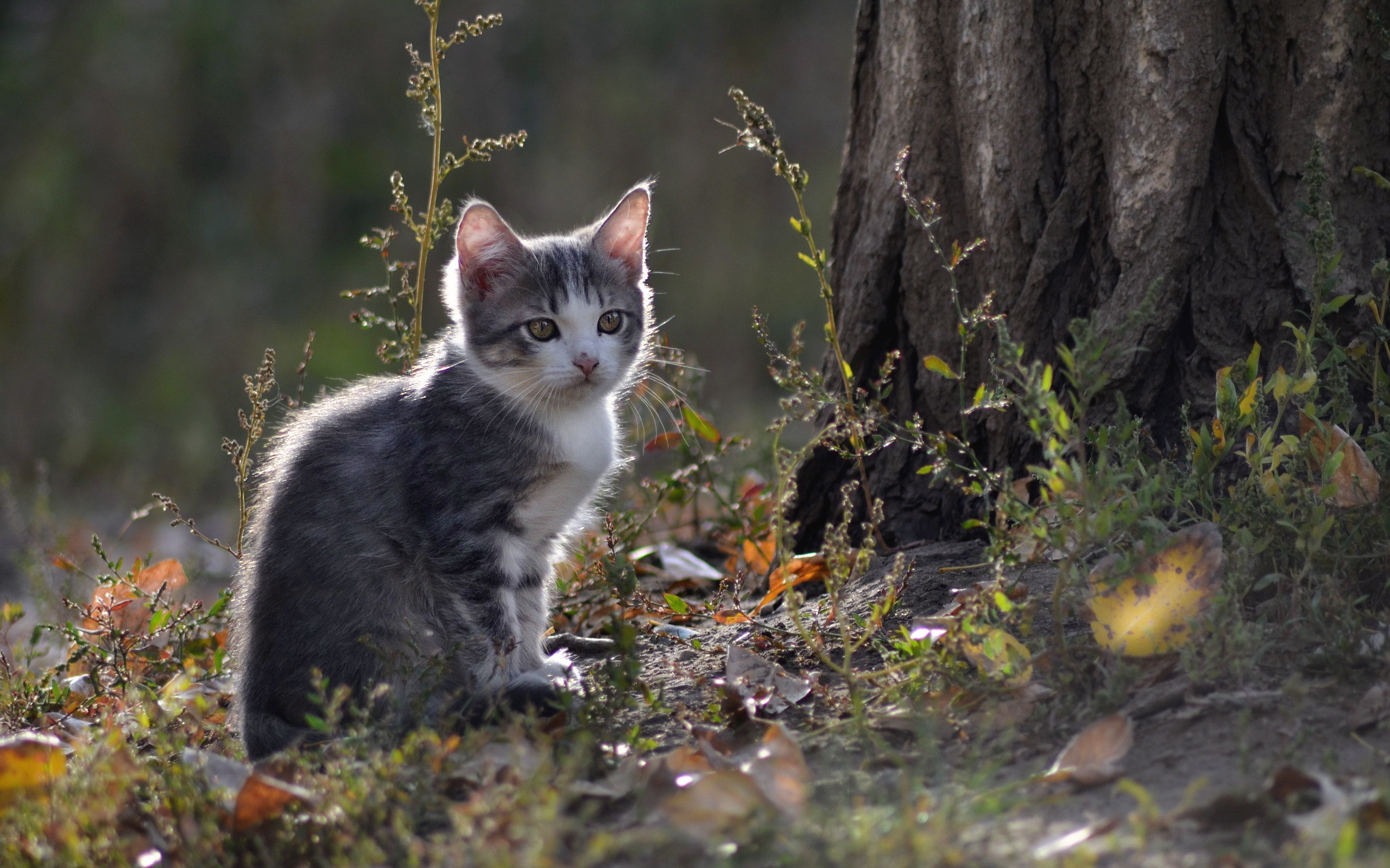 Description: A cat sitting in the grass next to a tree and a tree trunk with leaves on it and a small bird sitting on the ground.