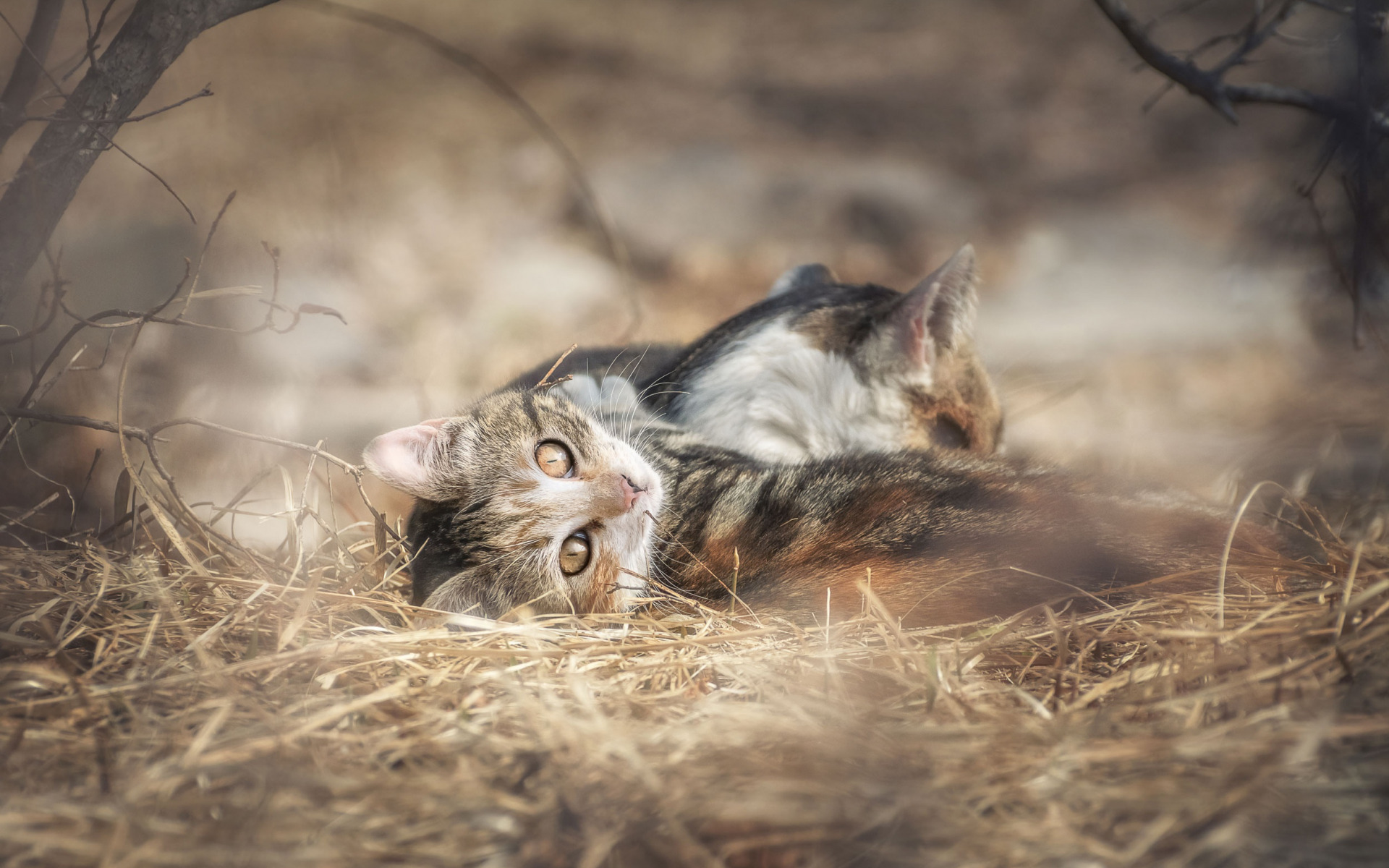 Description: A cat laying in the grass next to a tree and a bush with no leaves on it.