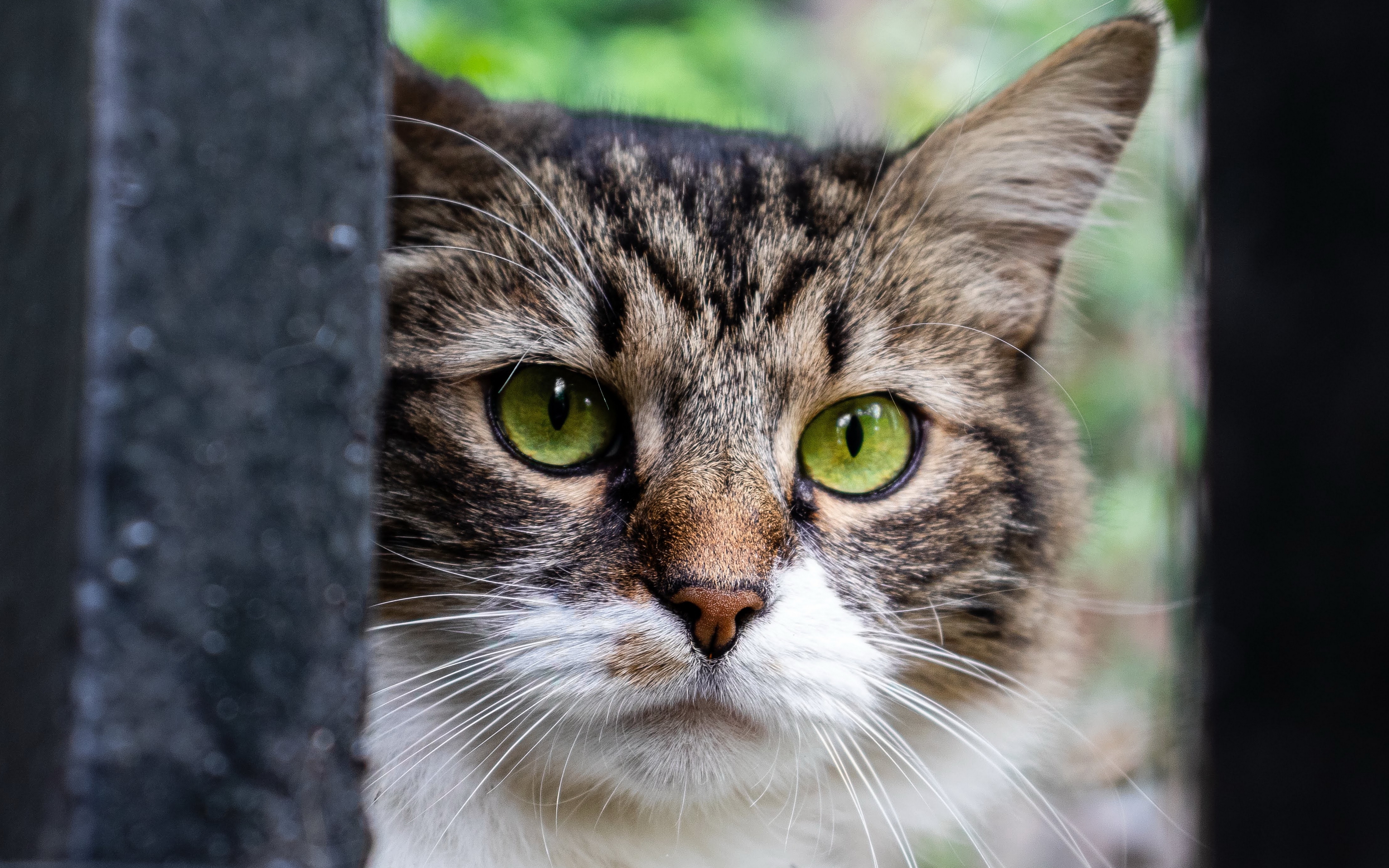 Description: A cat with green eyes looking out from behind a fence post with a green eye on it's face.