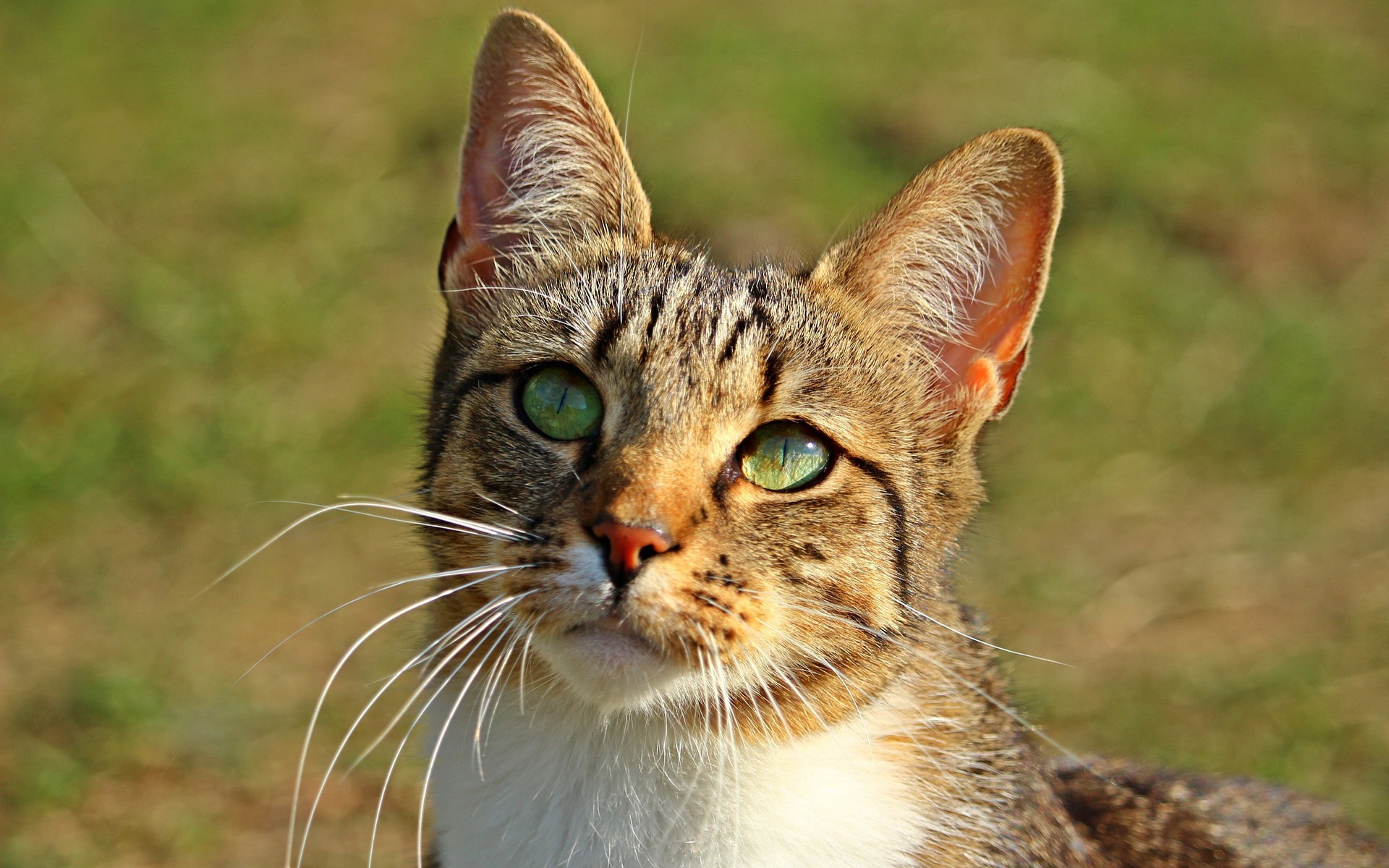 Description: A cat with green eyes looking up at the camera with a blurry background of grass and grass behind it.