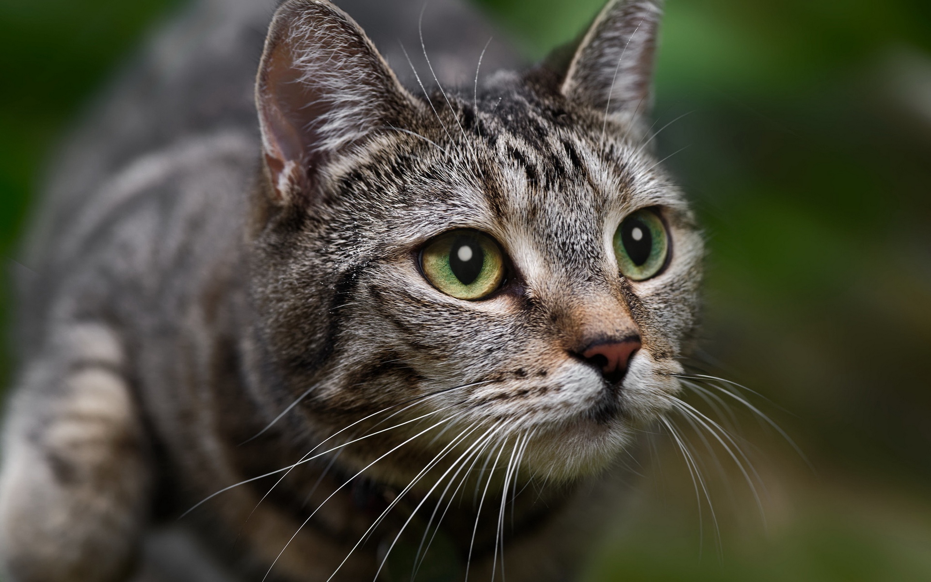 Description: A cat with green eyes looking at something with a blurry background of grass and bushes in the background.