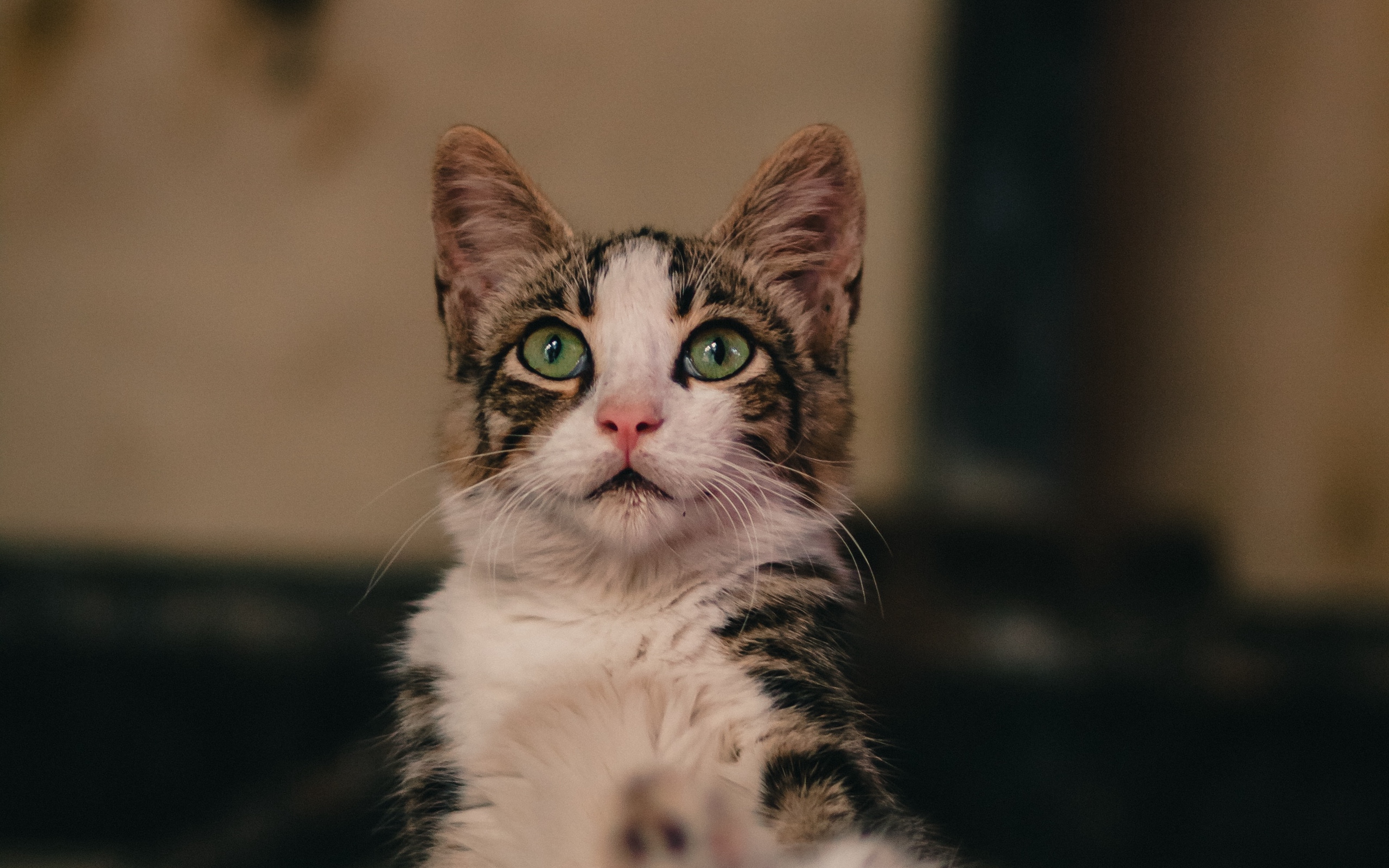 Description: A cat with green eyes looking up at the camera with a serious look on its face and chest.