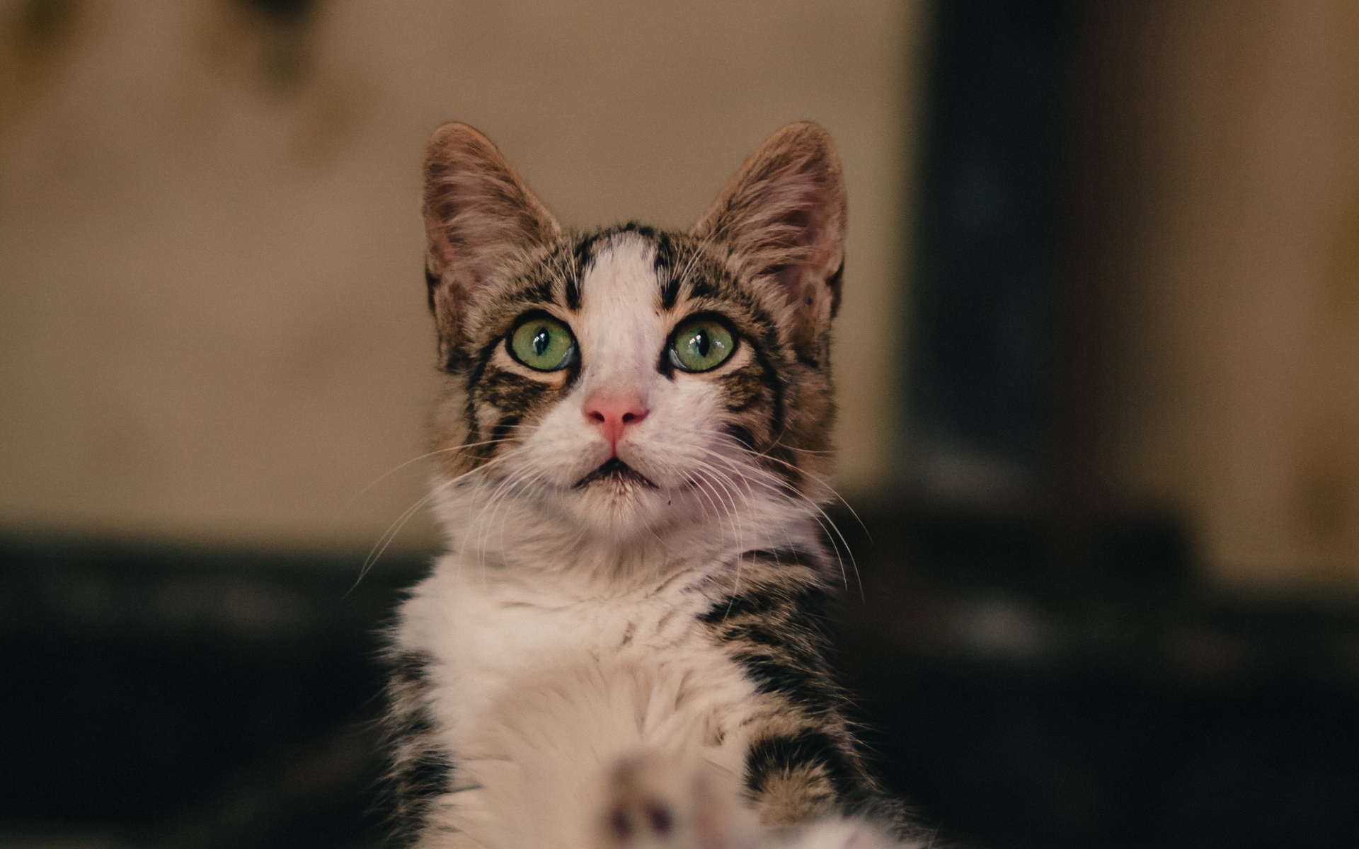 Description: A cat with green eyes looking up at the camera with a serious look on its face and paw.