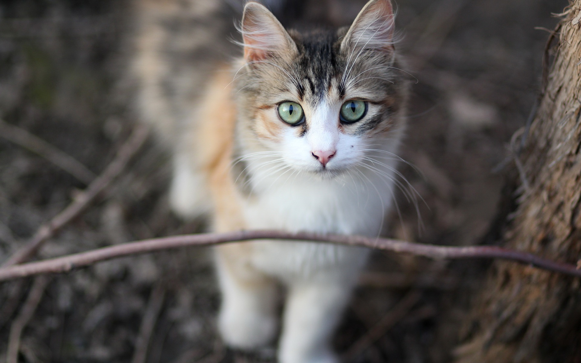Description: A cat with green eyes standing next to a tree branch in the woods.
