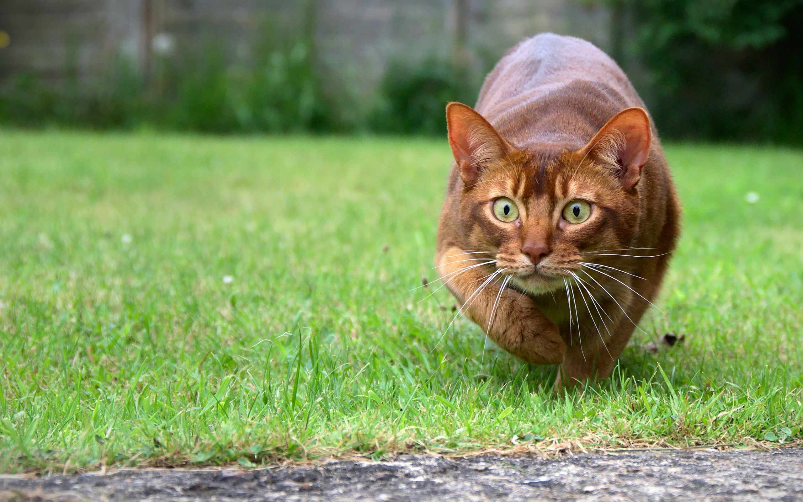 Description: A cat walking across a lush green field of grass next to a sidewalk and a fenced in area.