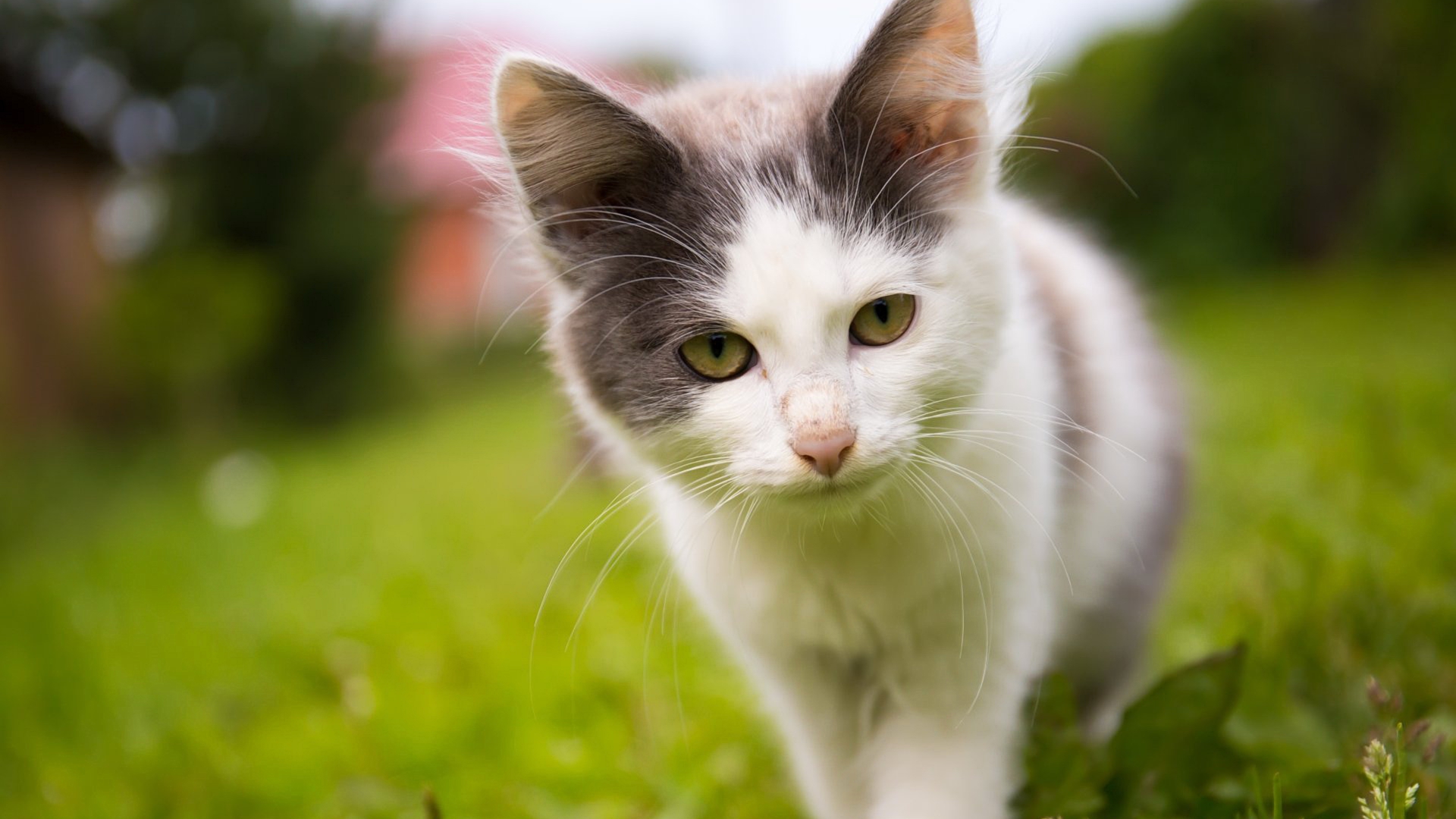 Description: A cat walking across a lush green field of grass with a house in the background and a red building in the distance.