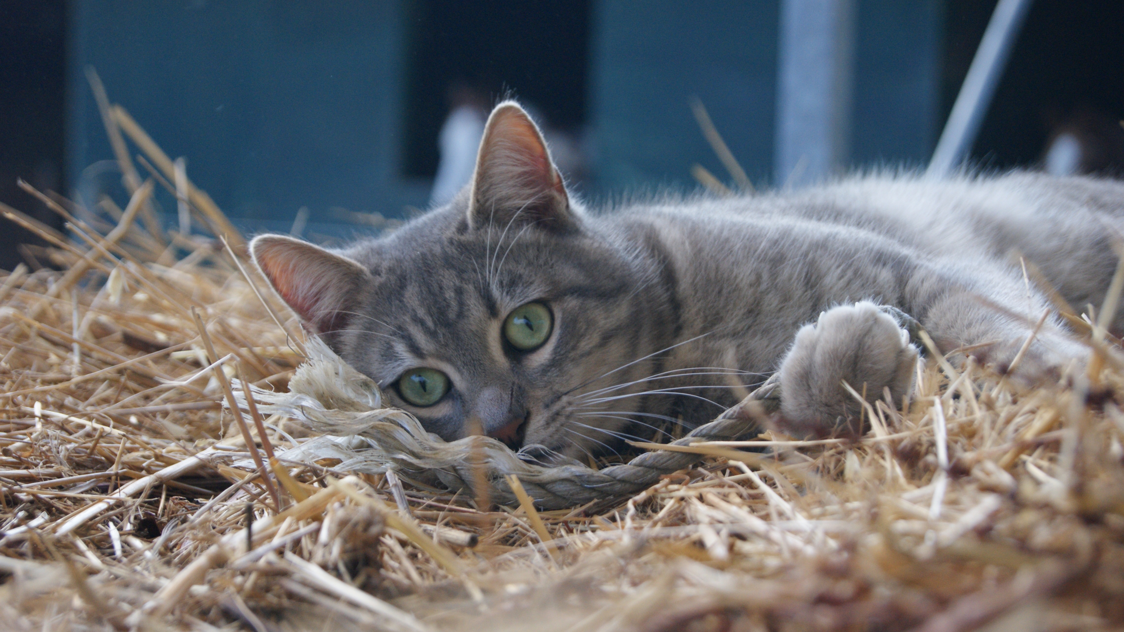 Description: A cat laying on top of a pile of hay next to a window with a blue curtain behind it.