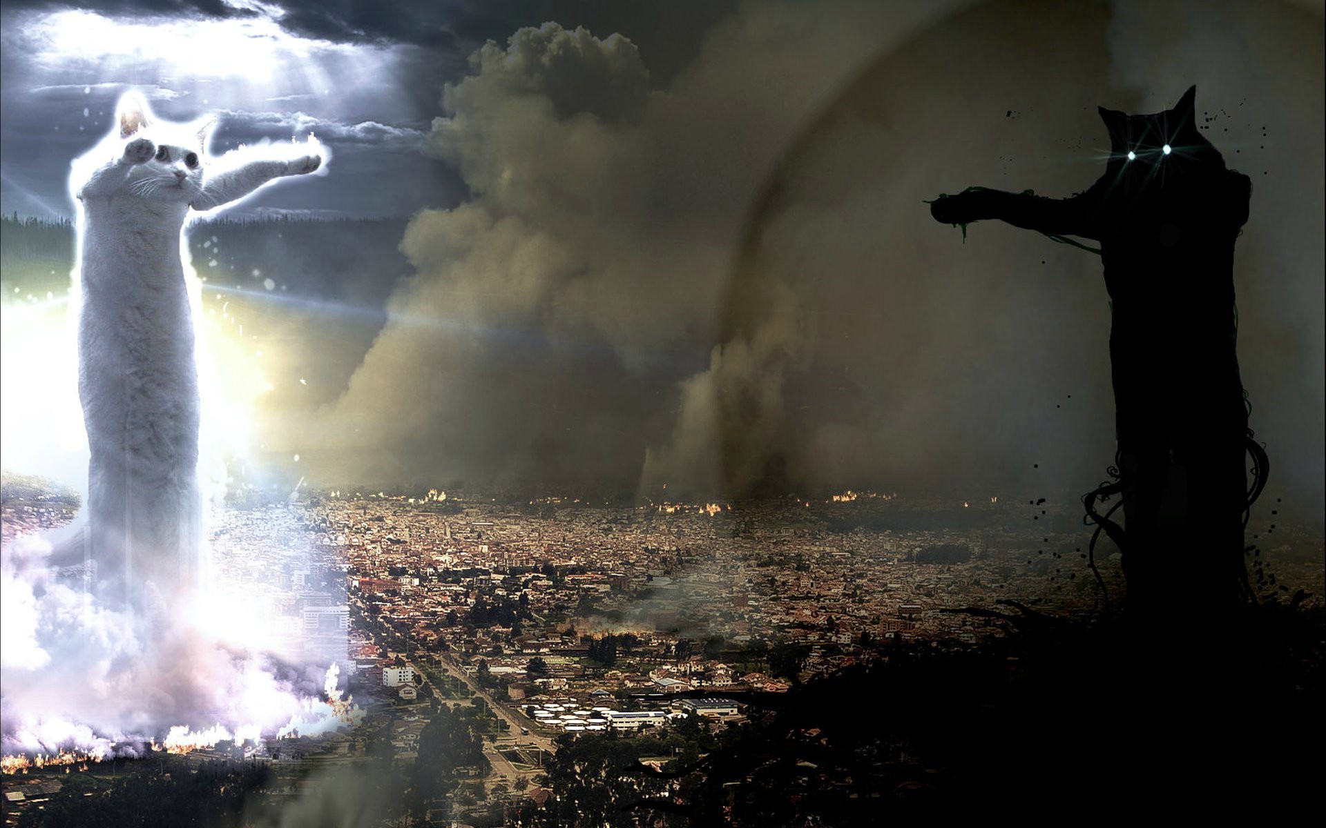 Description: A cat standing on top of a hill next to a city under a cloudy sky with a rainbow in the sky.