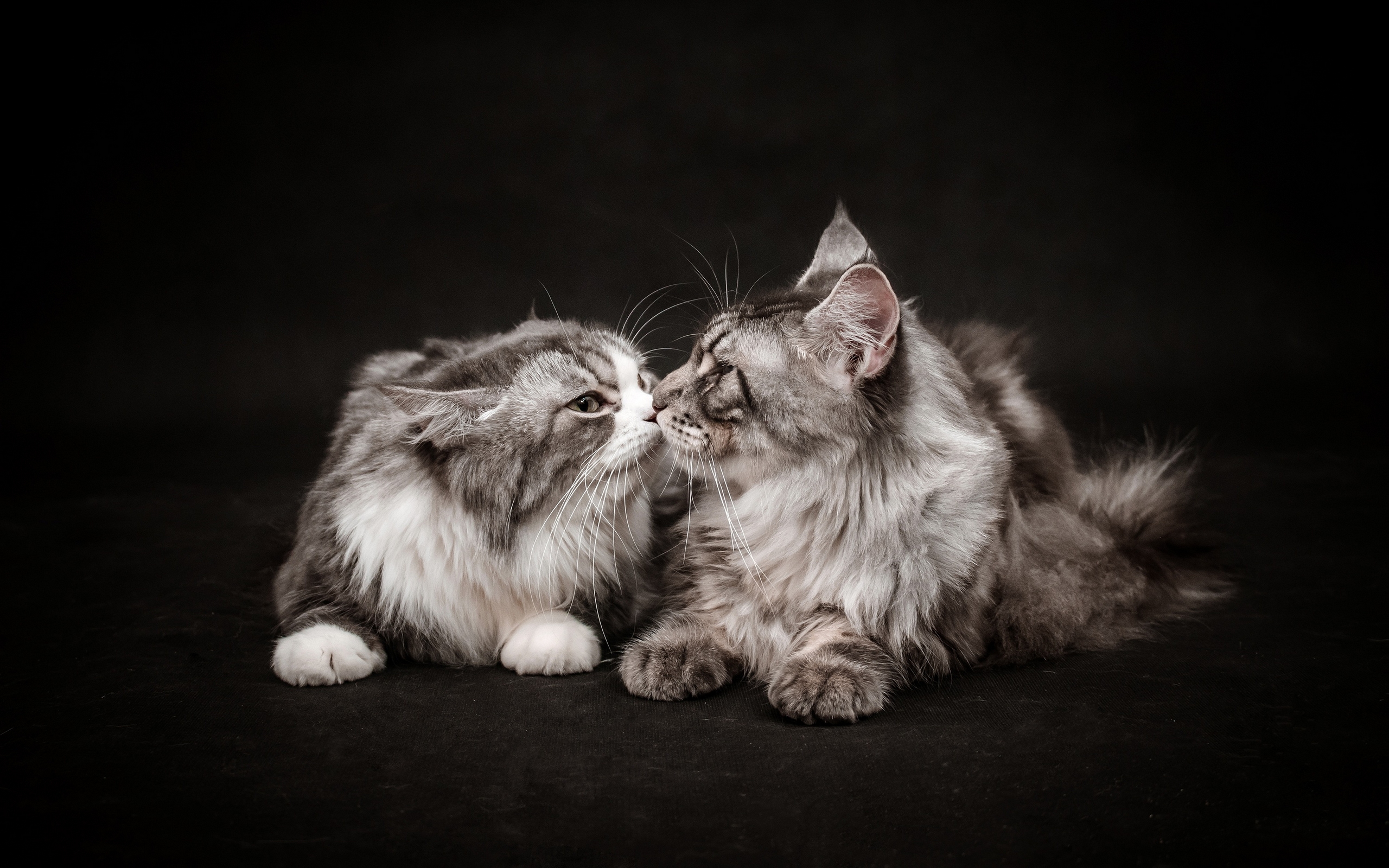 Description: A cat is kissing another cat on the nose on a black background in the dark room with a black background.