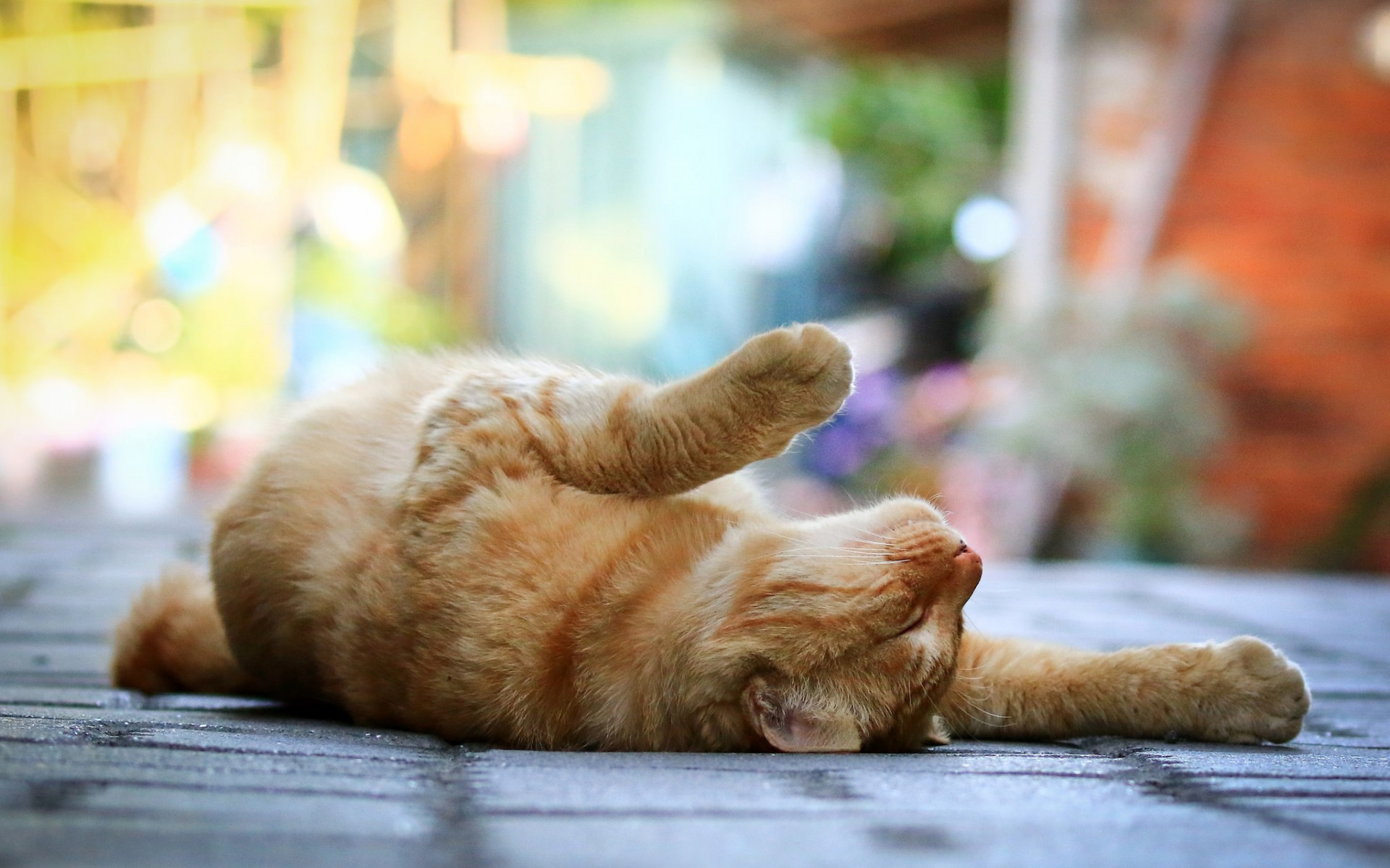 Description: A cat laying on its back on the ground with its paws in the air and its eyes closed.