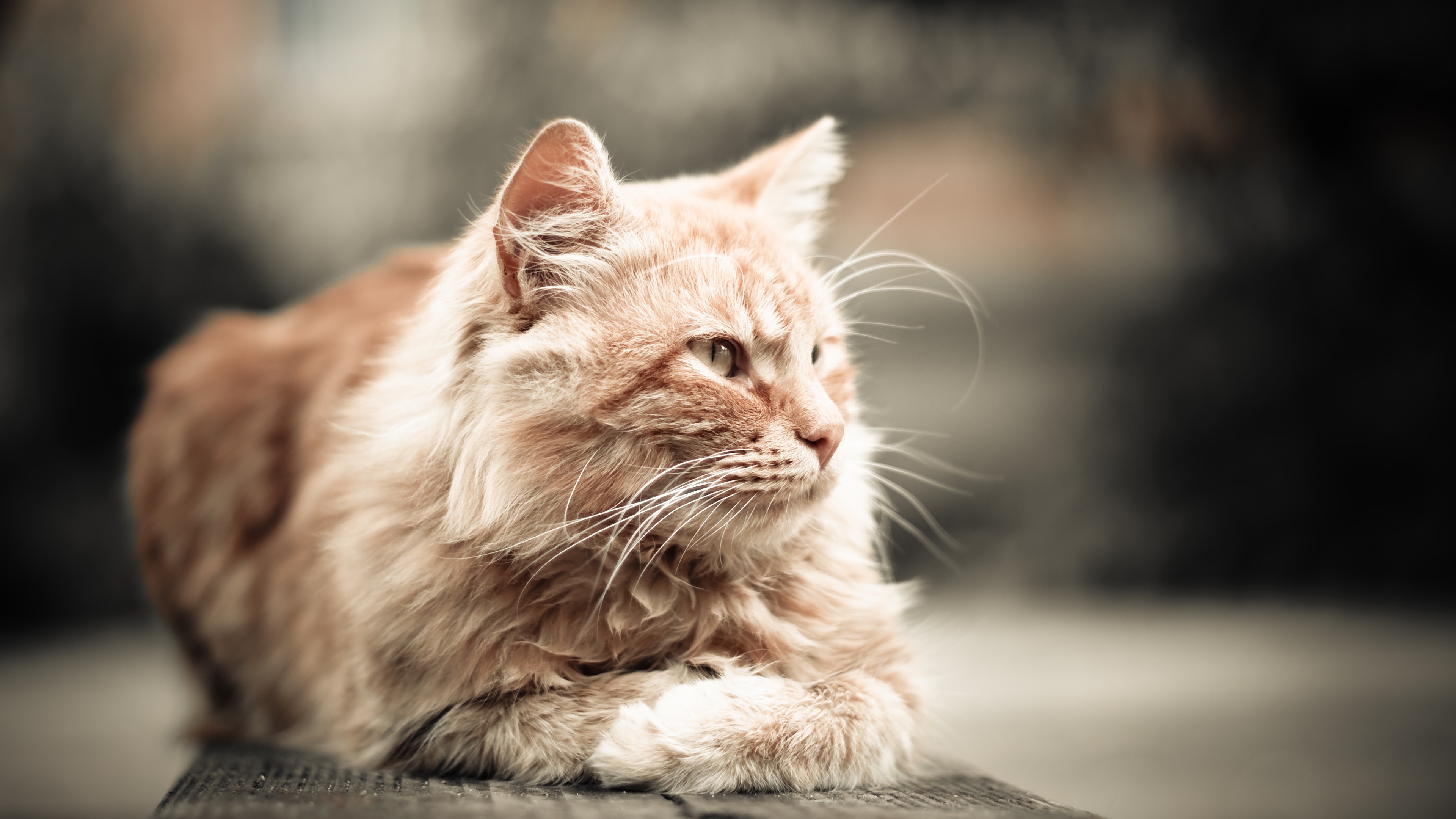 Description: A cat laying on a table looking at something in the distance with a blurry background of the image.