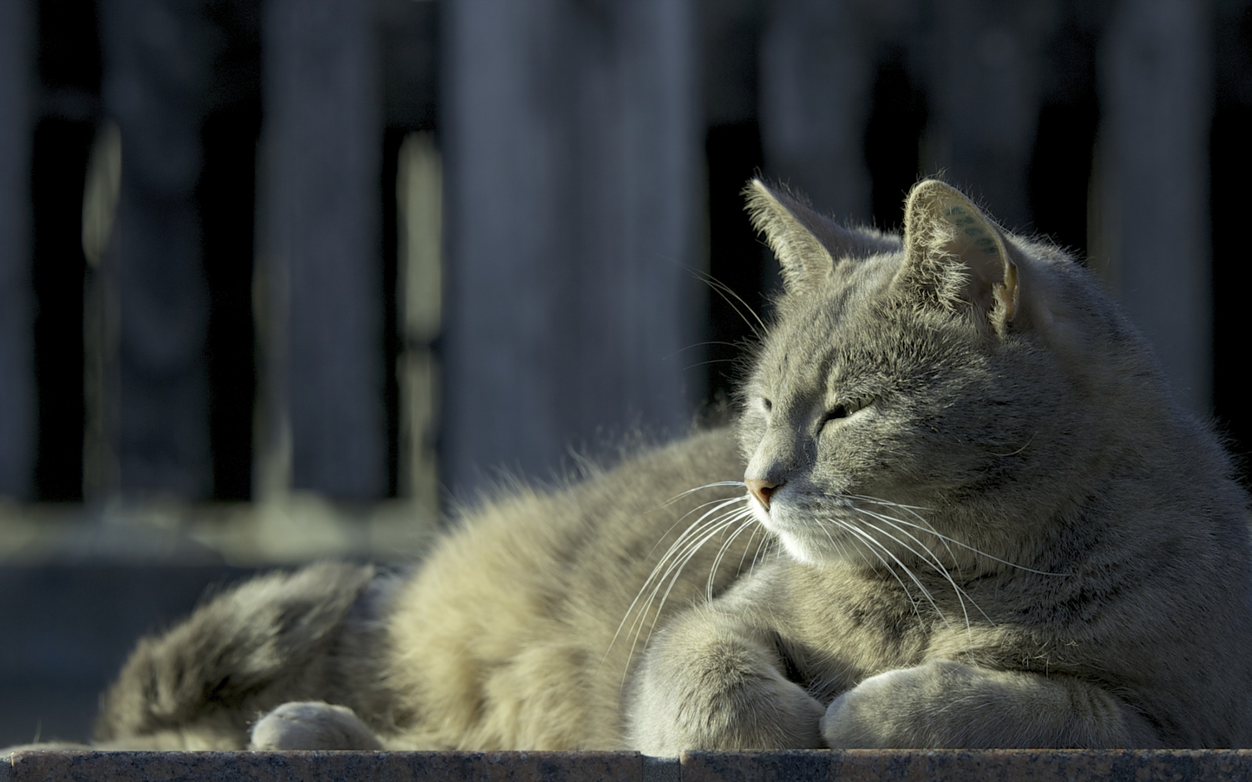 Description: A cat is laying down on a wooden bench outside of a fenced in area with a wooden fence.