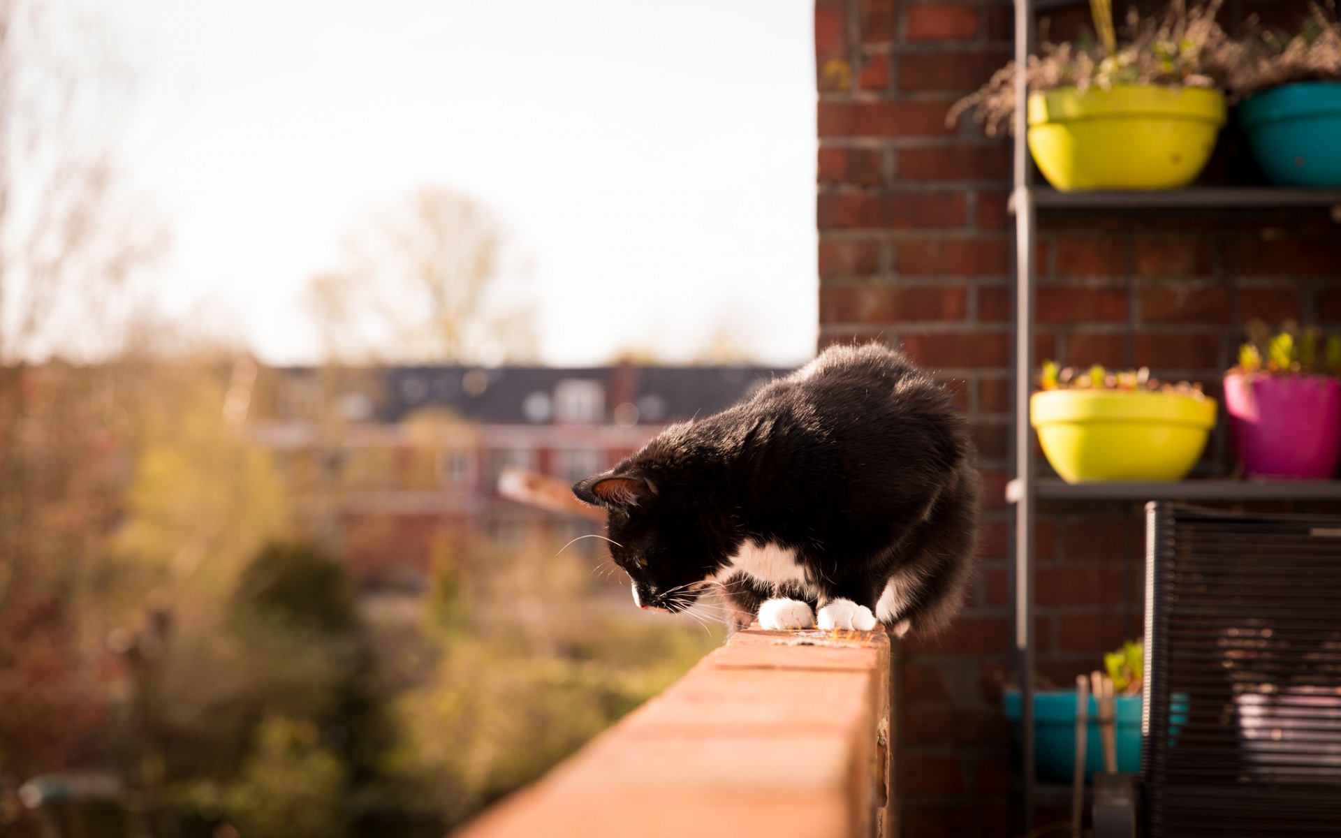 Description: A cat is standing on a ledge looking at something in the distance with a building in the background and a few plants in the background.