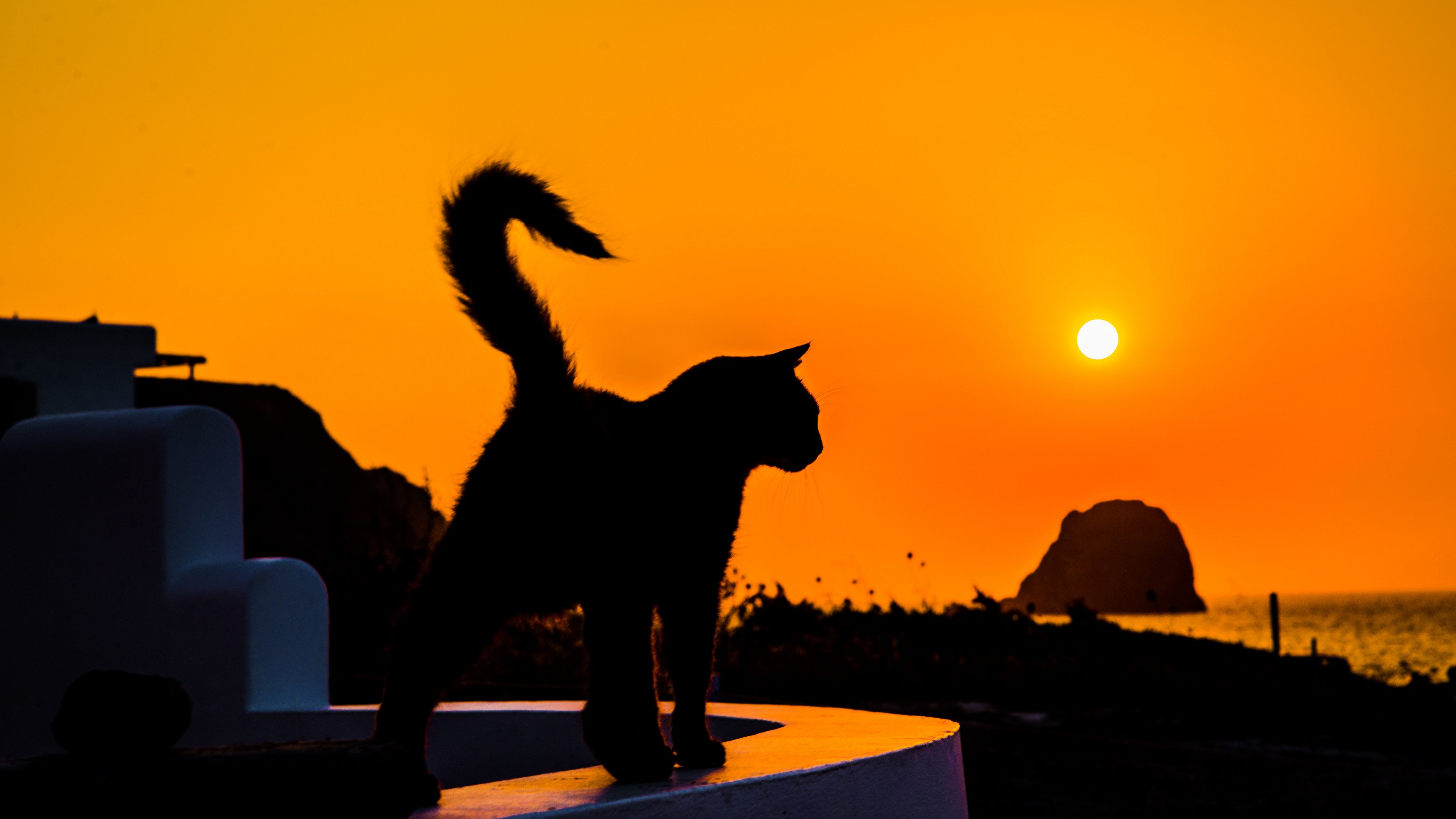 Description: A cat standing on a ledge at sunset with the sun in the background and a silhouette of a cat.