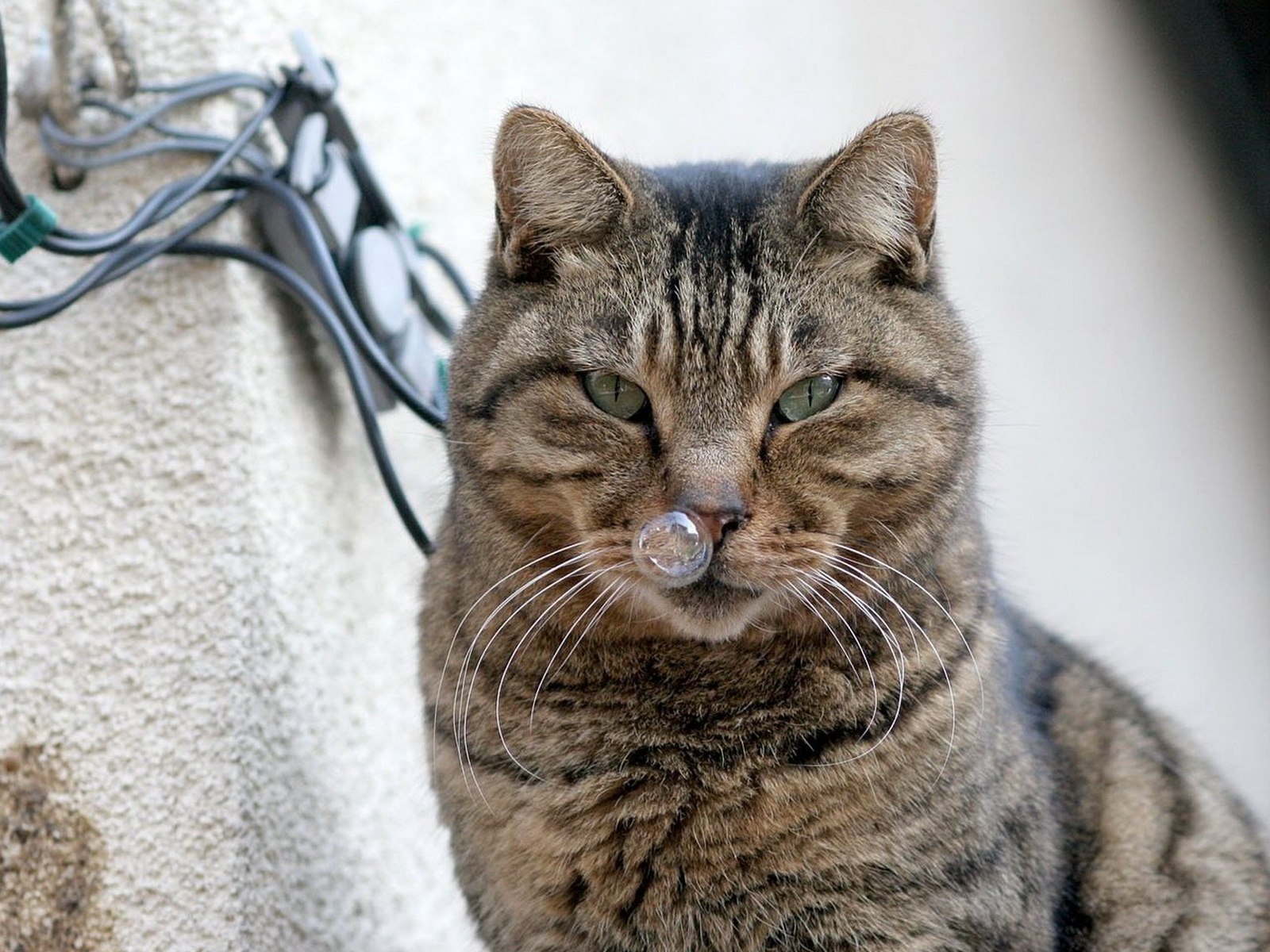 Description: A cat sitting on a ledge with a wire attached to it's side and a wall behind it.