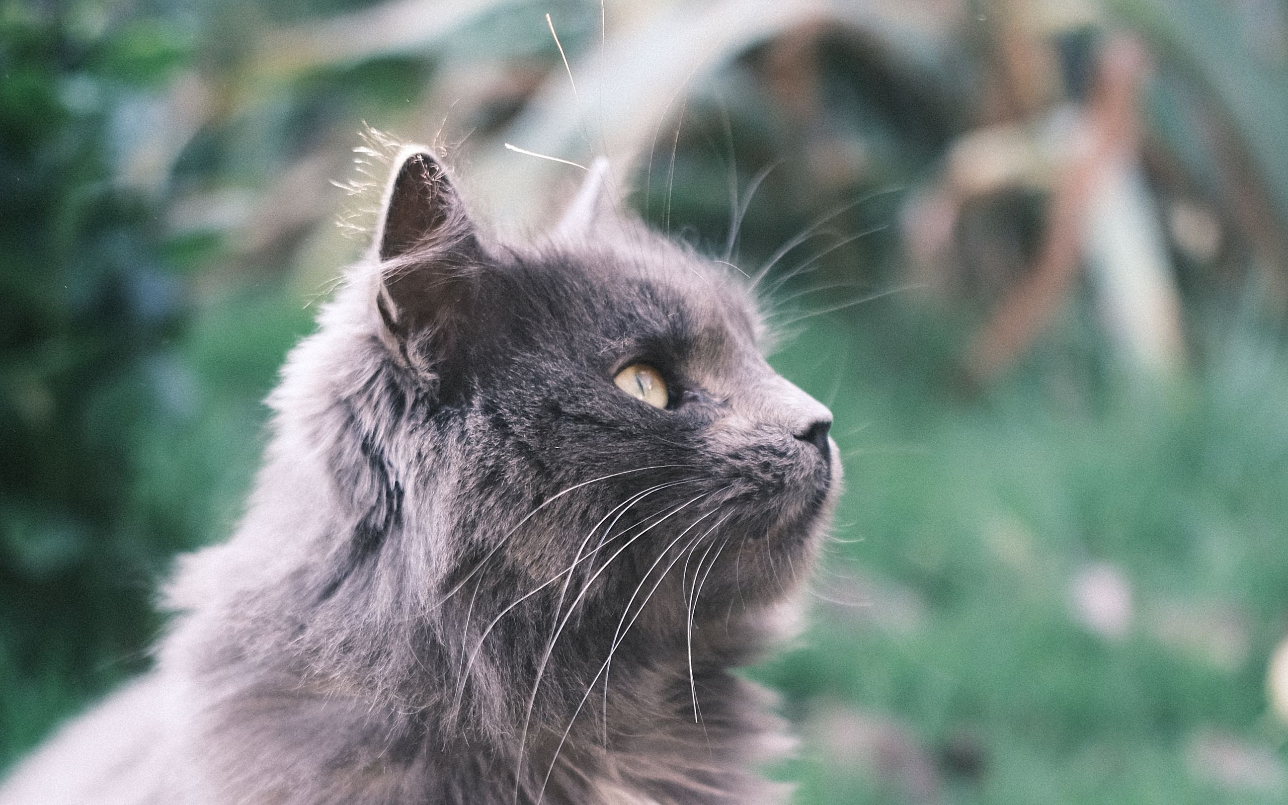 Description: A cat looking up at something in the air with a blurry background of grass and trees in the background.