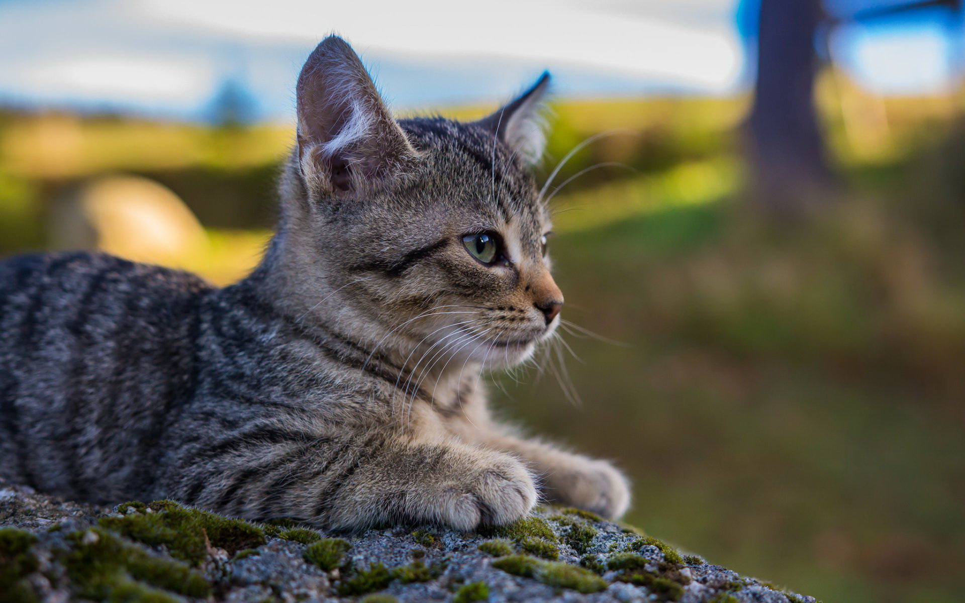 Description: A cat laying on a mossy rock in the woods looking at something in the distance with a blurry sky in the background.