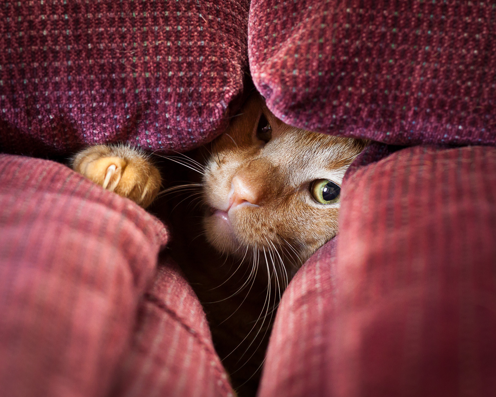Description: A cat peeking out from under a blanket on a couch or couch cushion with its paw on the pillow.