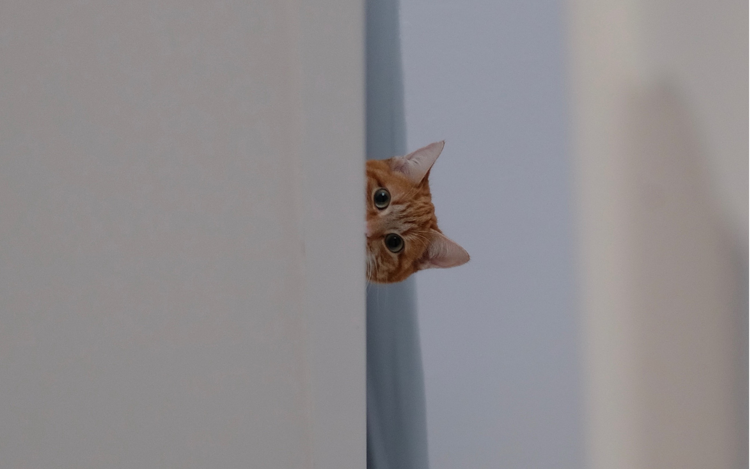 Description: A cat peeking out from behind a wall with its head peeking out of the wall.
