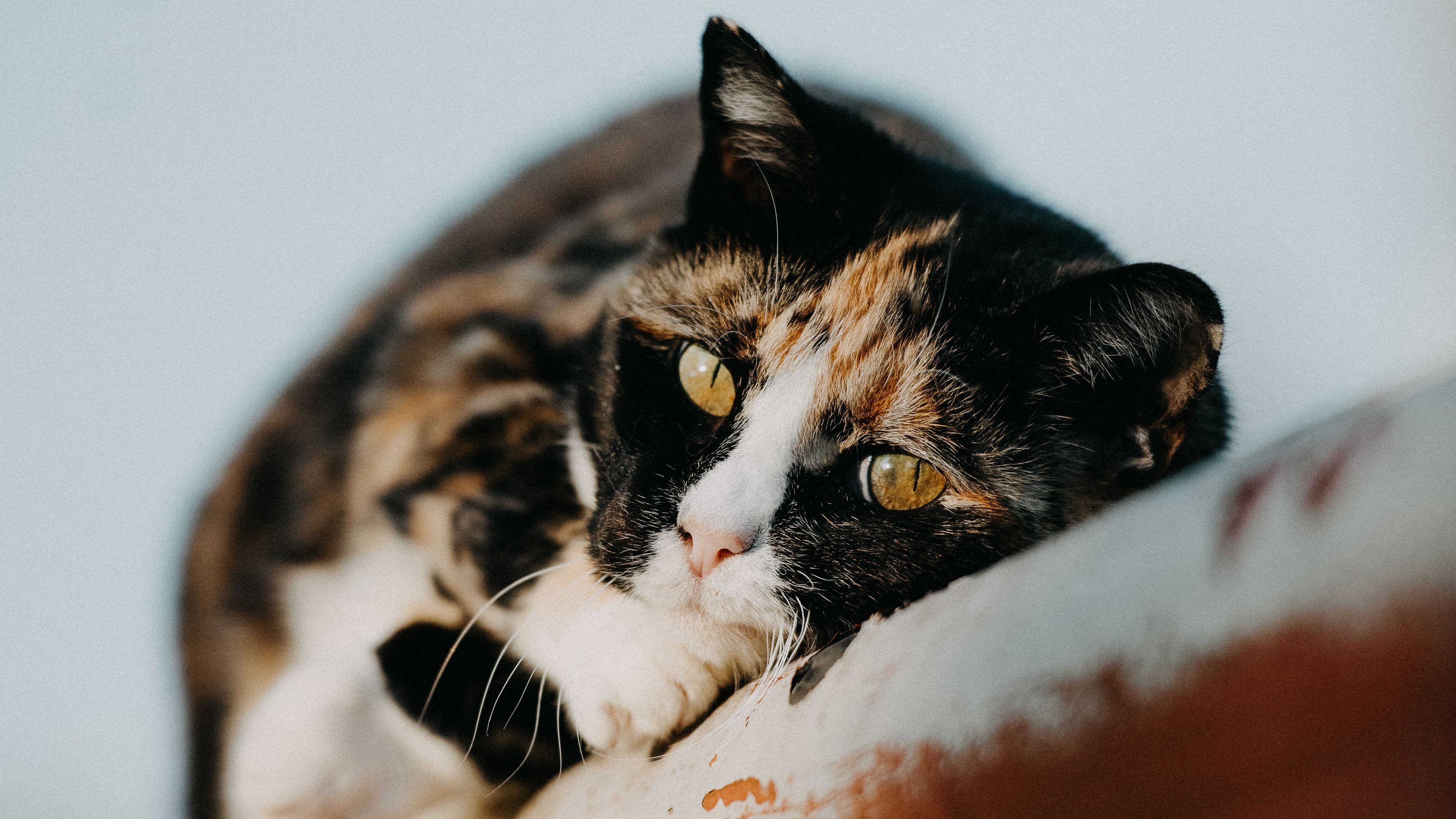 Description: A cat is sitting on a pillow looking at the camera lens is on the cat's face and the cat is looking at the camera lens.