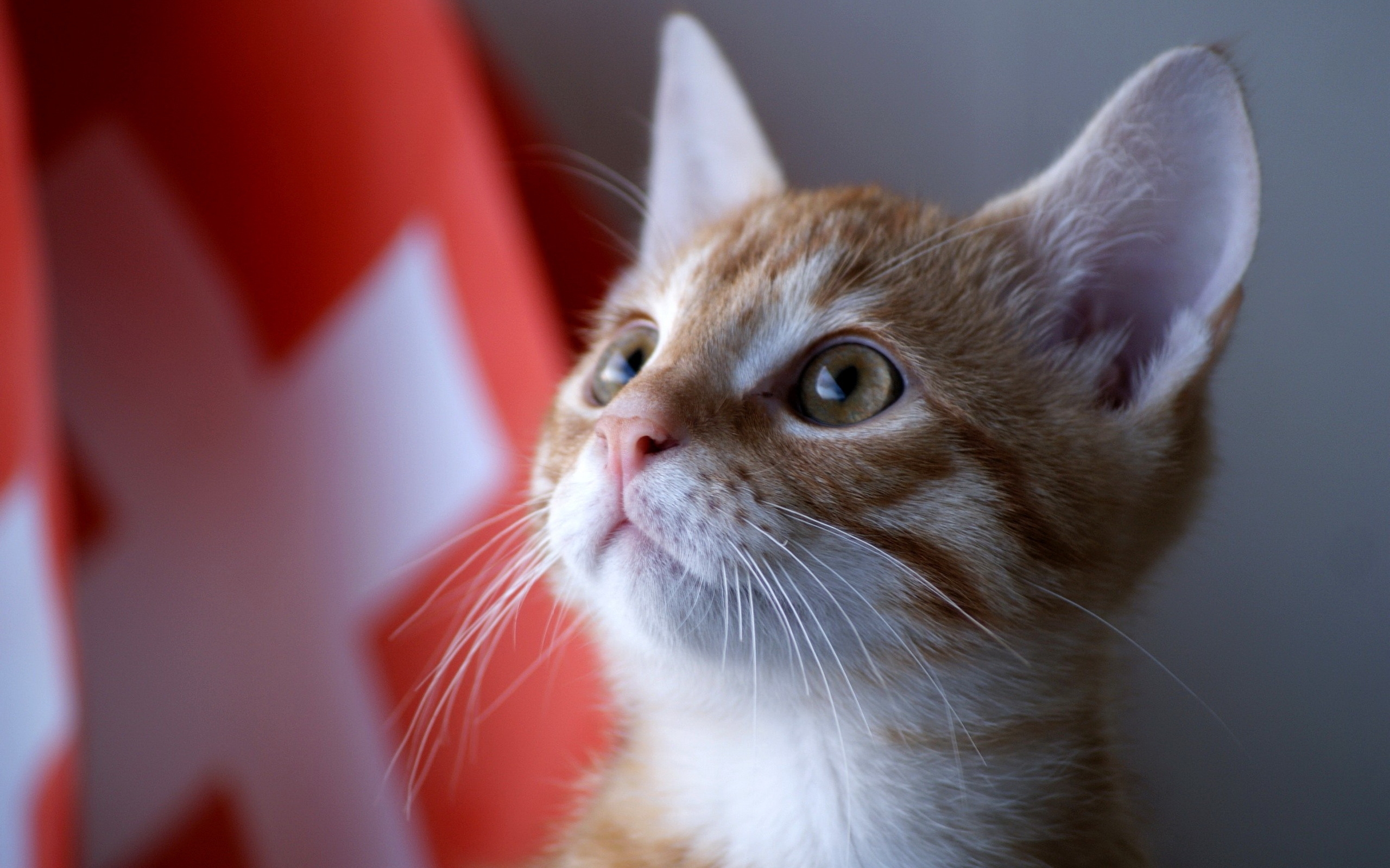 Description: A cat looking up at something with a red and white background behind it and a white cross on the right side of the image.