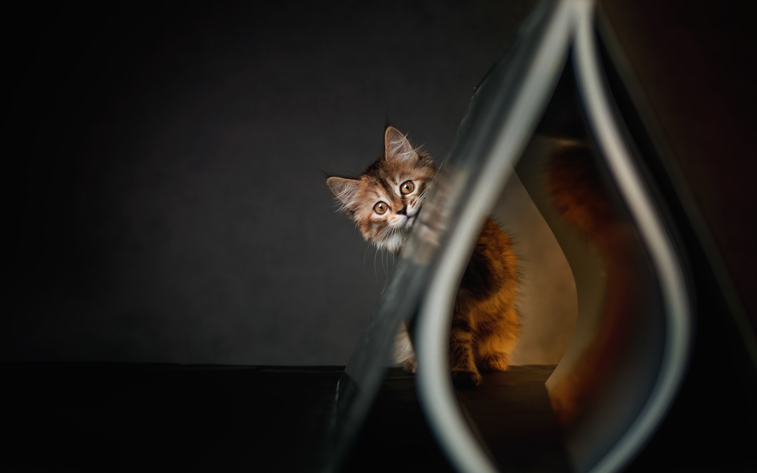 Description: A cat is looking out of a window at something in the dark room that is reflected in the glass.