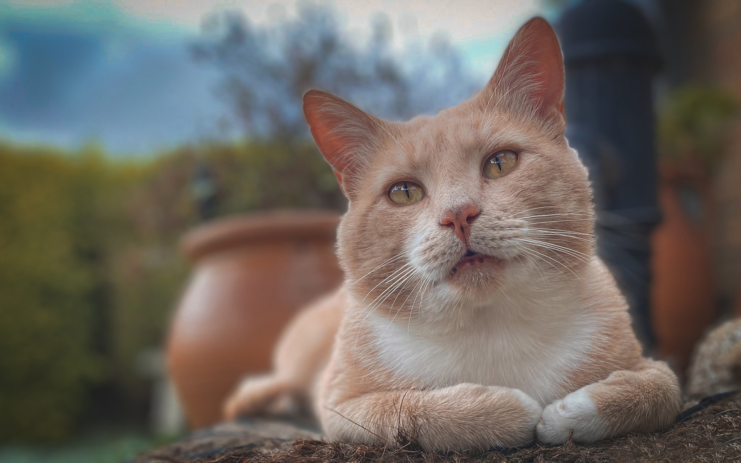 Description: A cat sitting on a rock looking up at the camera with a blurry background of a potted plant.
