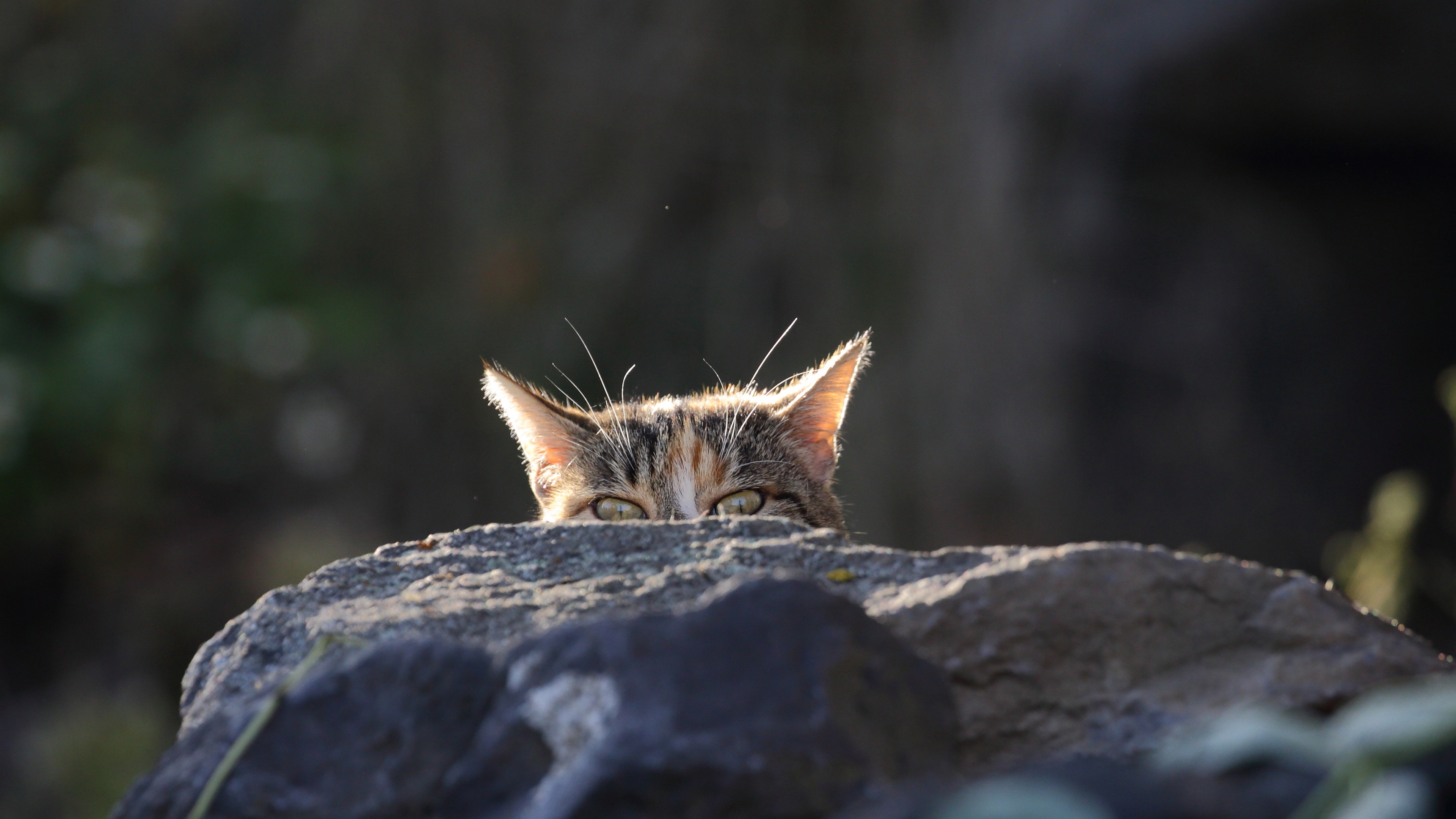 Description: A cat is sitting on a rock looking at the camera with a blurry background of trees and bushes.