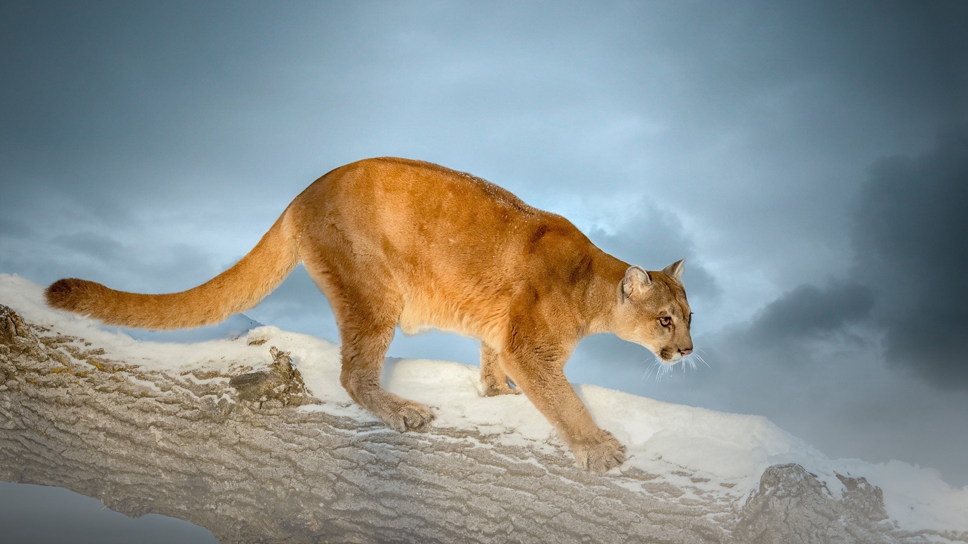Description: A cat walking on a rock in the snow under a cloudy sky with clouds in the background and a mountain in the foreground.