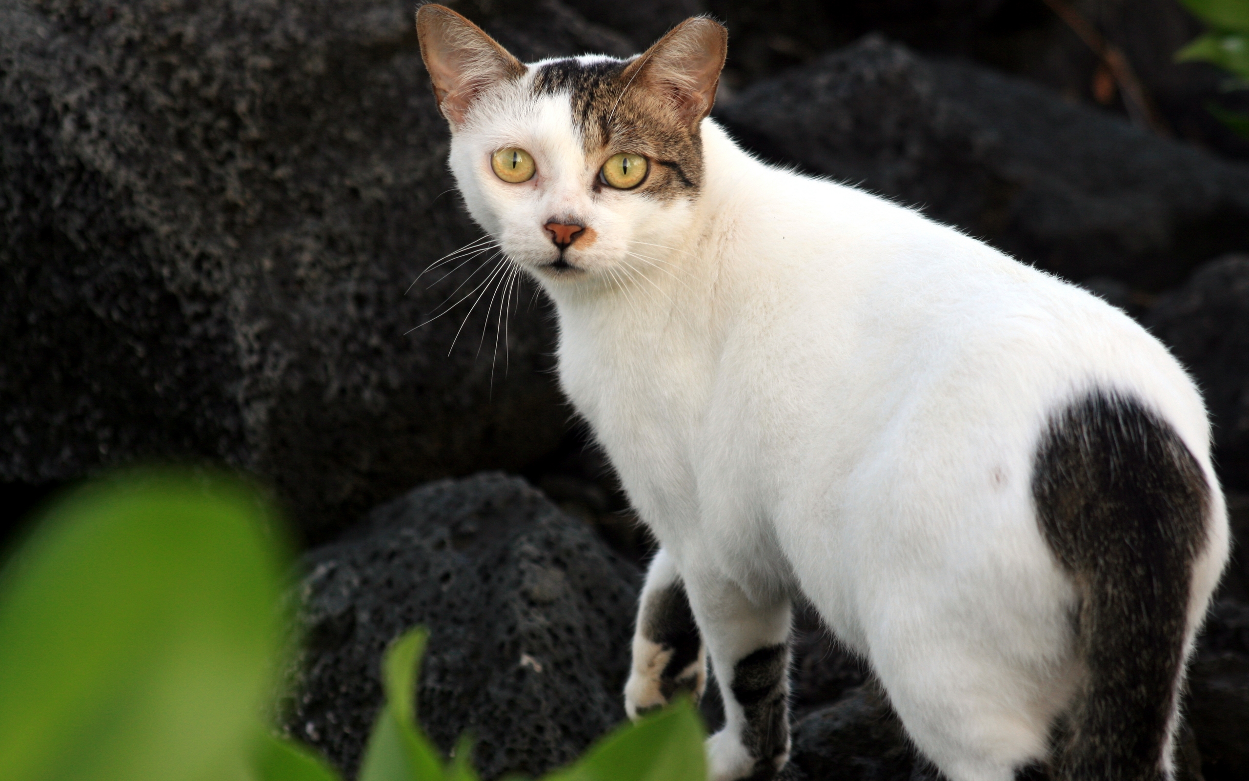 Description: A cat standing on a rock in the sun with a green plant in the foreground and a black rock in the background.