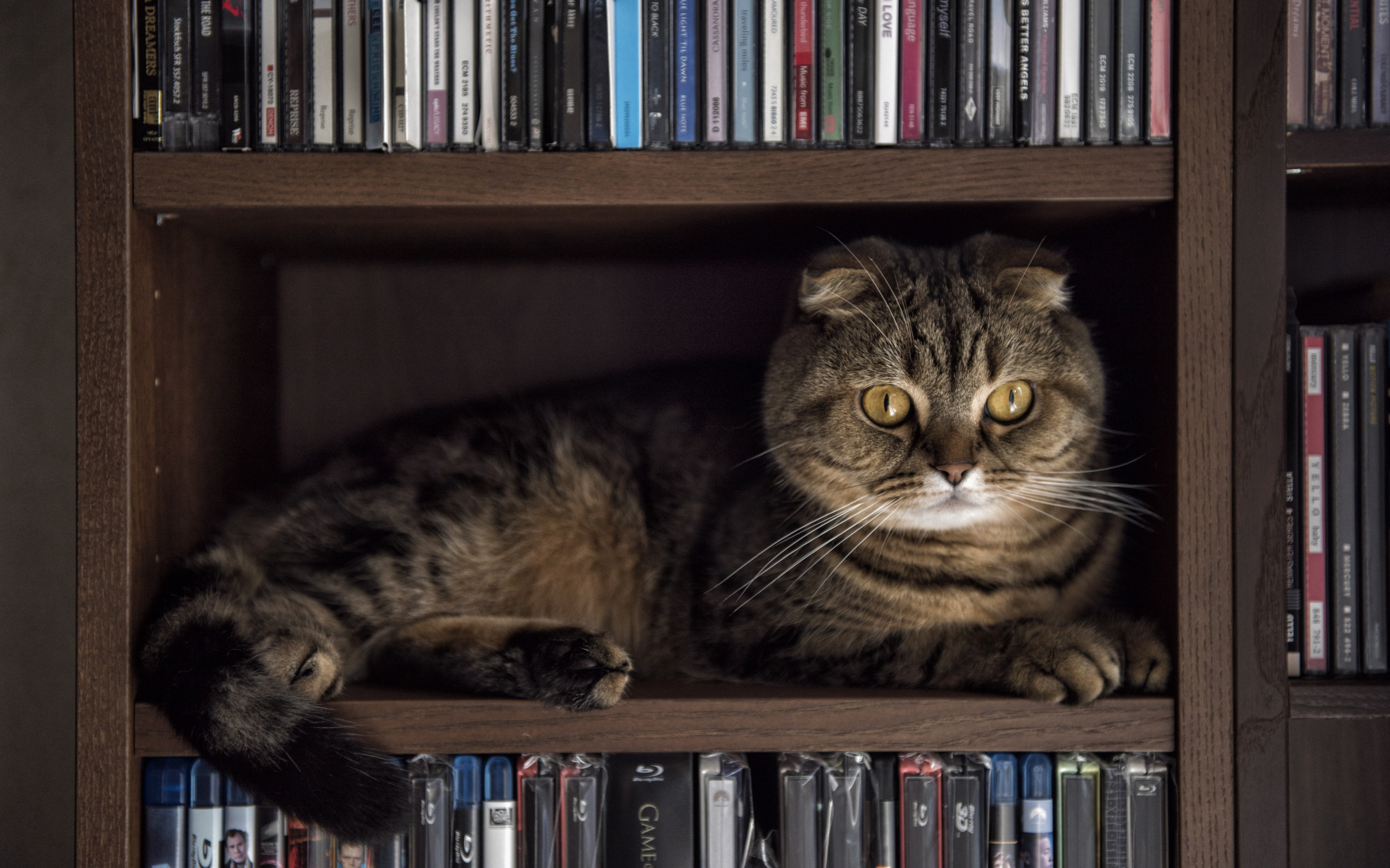 Description: A cat is sitting on a book shelf with many dvds on it's shelves and looking at the camera.