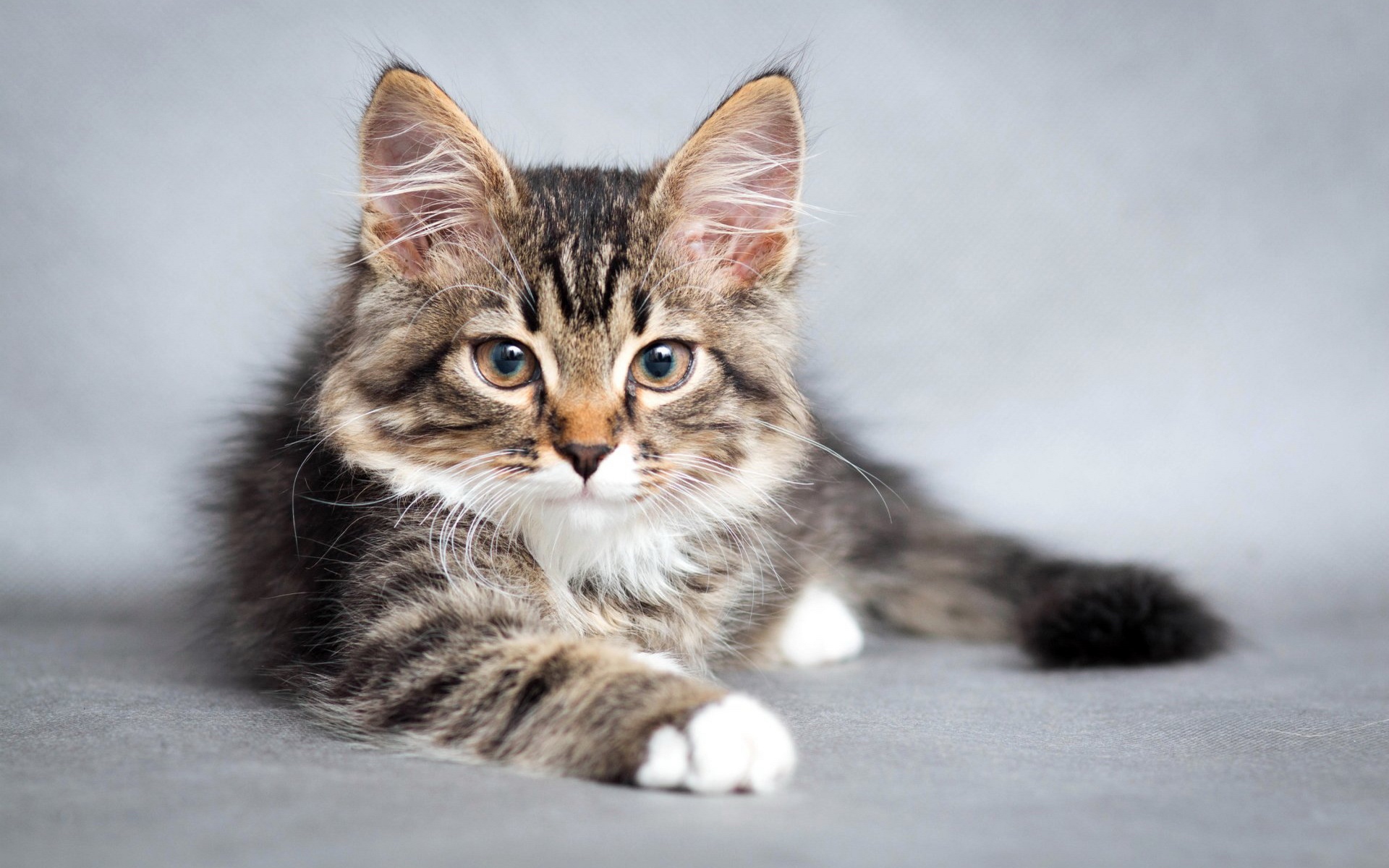 Description: A cat laying down on a gray surface with a white and black stripe on it's face and paws.