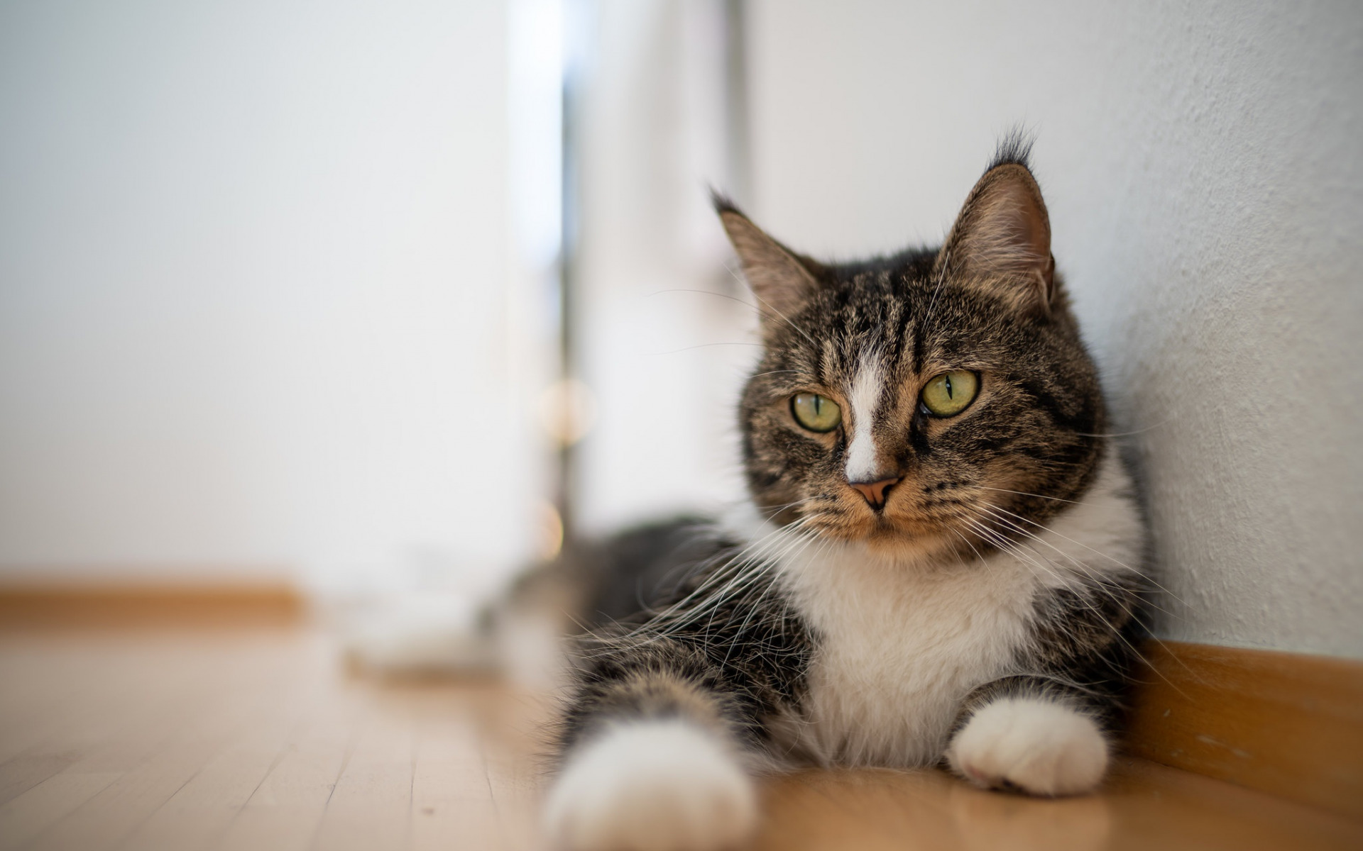 Description: A cat sitting on the floor looking at the camera with a blurry background of the wall and floor.