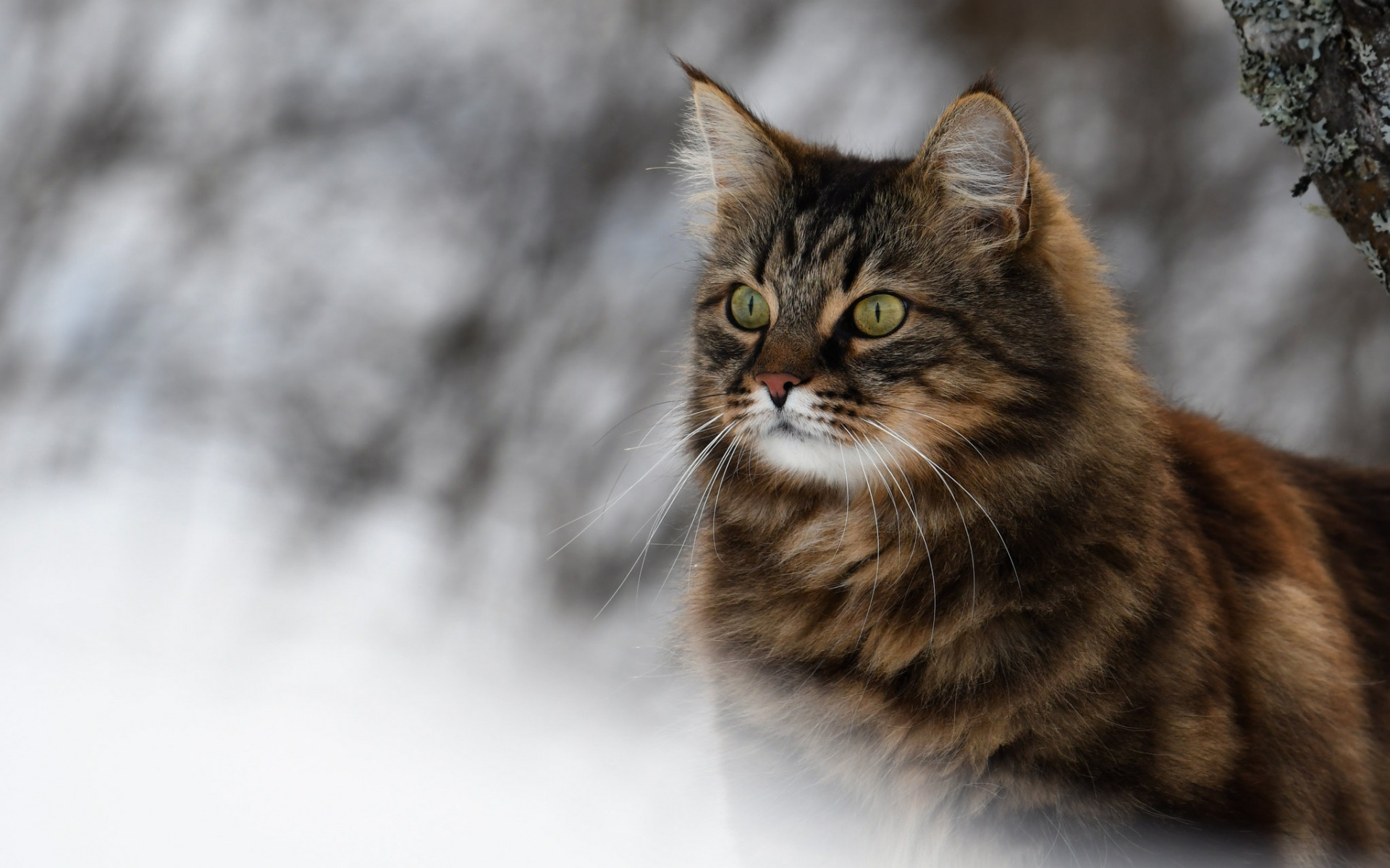 Description: A cat is sitting in the snow near a tree branch with green eyes and a blurry background of snow.