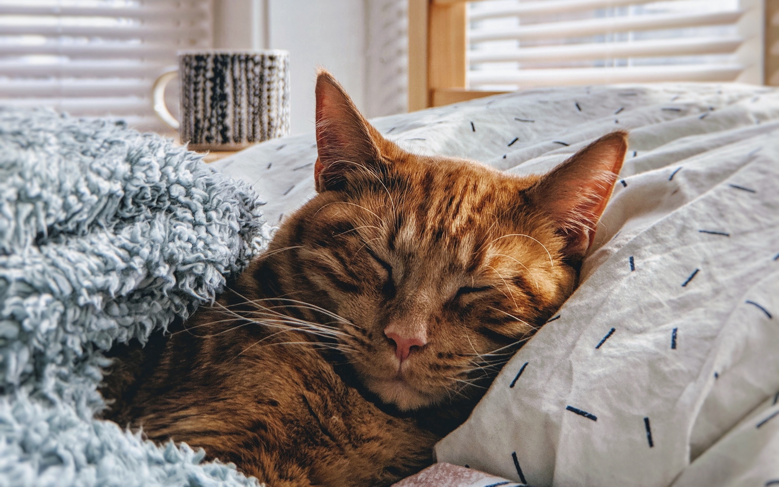 Description: A cat sleeping on a bed with a blanket and a cup of coffee in the background with blinds on the window.