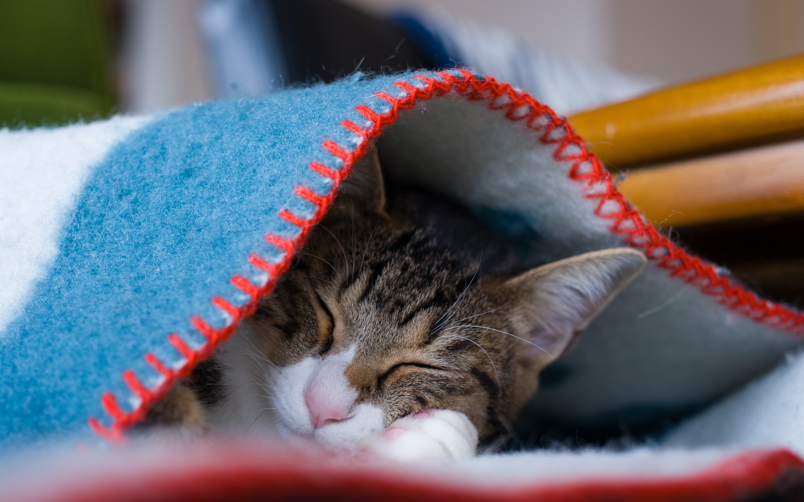 Description: A cat is sleeping in a blanket on a bed with a blanket on it's back and a wooden stick sticking out of it.