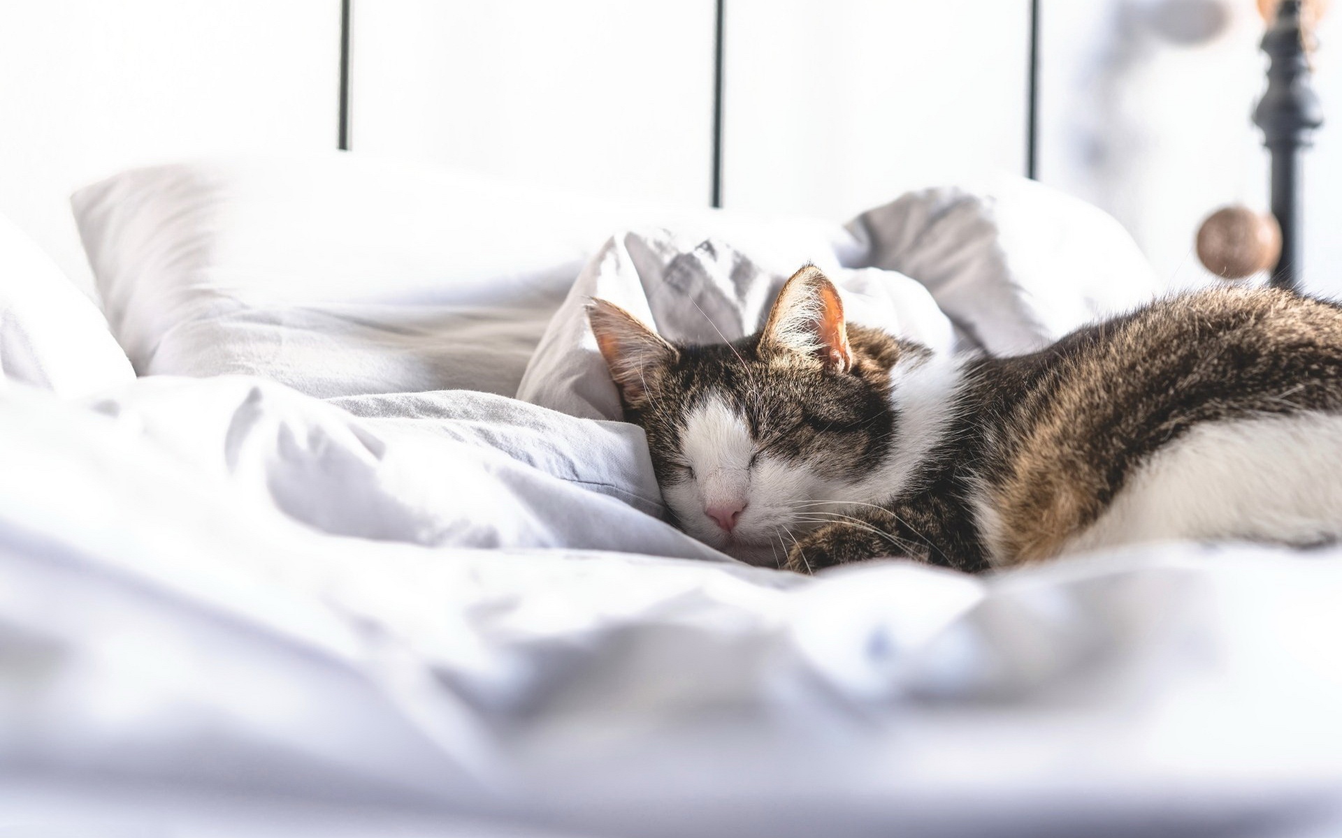 Description: A cat sleeping on a bed with white sheets and pillows on it's side and a black headboard.
