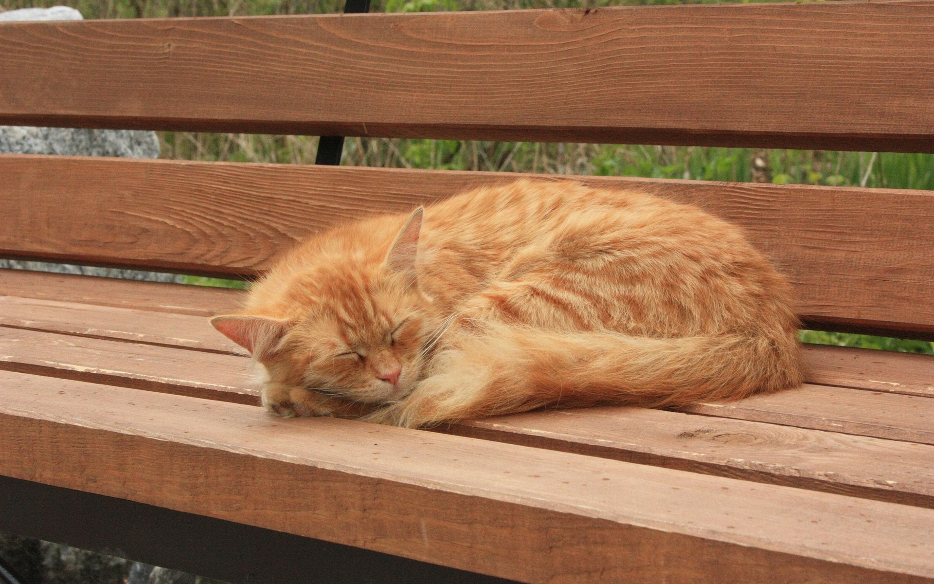 Description: A cat sleeping on a wooden bench outside in the sun.
