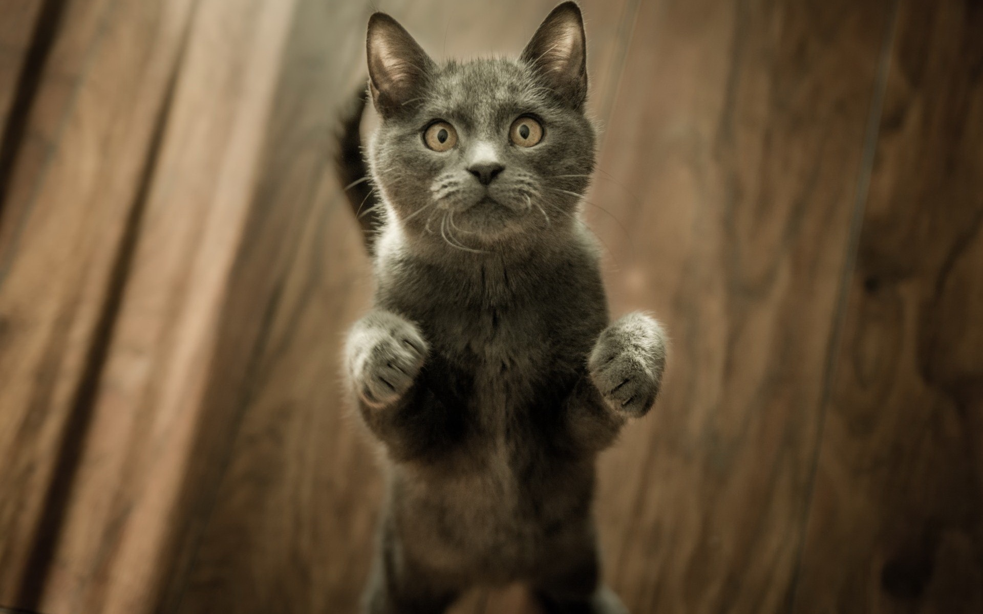Description: A cat standing on its hind legs on a wooden floor with its paws up in the air and looking up.
