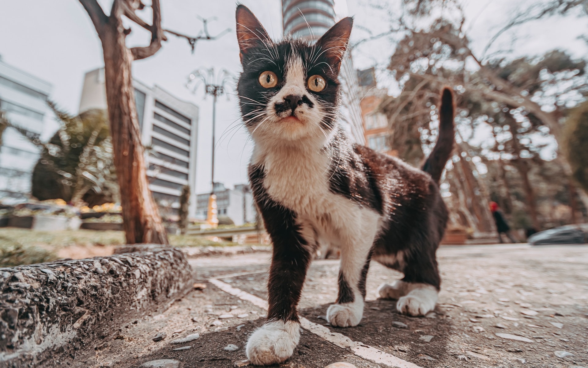Description: A cat standing on a street next to a tree and a building with a clock tower in the background.