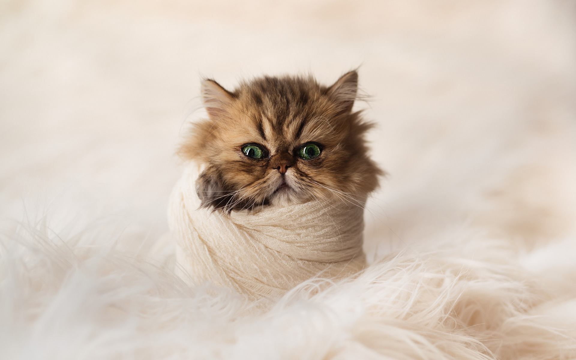 Description: A cat with a sweater around its neck on a white blanket with a fuzzy background and a green eyed cat.