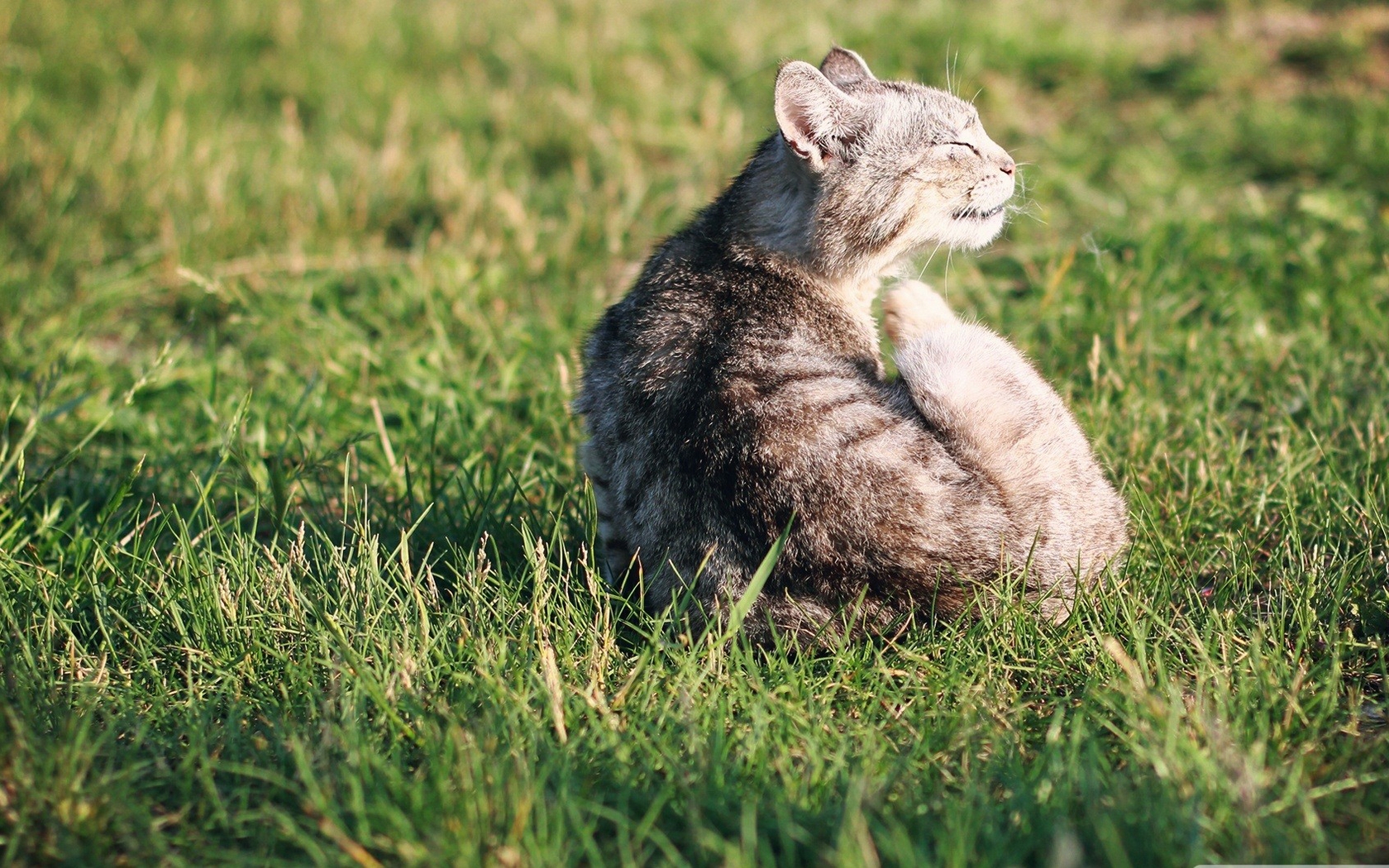 Description: A cat sitting in the grass looking up at something in the distance with its eyes closed and head tilted.