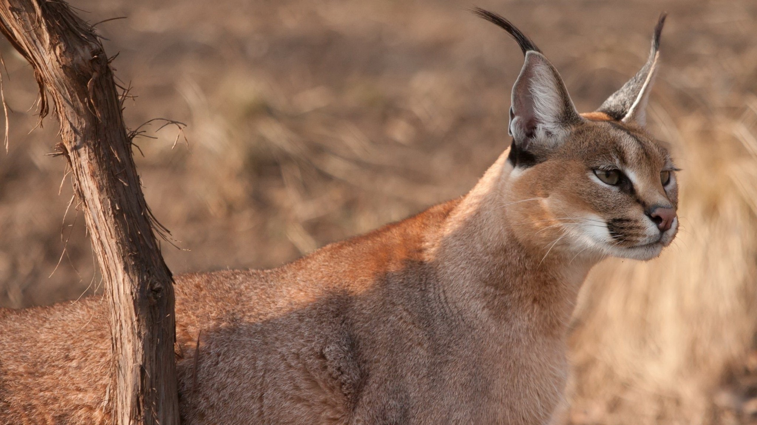 Description: A close up of a cat near a tree in a field of grass and dirt with a blurry background.