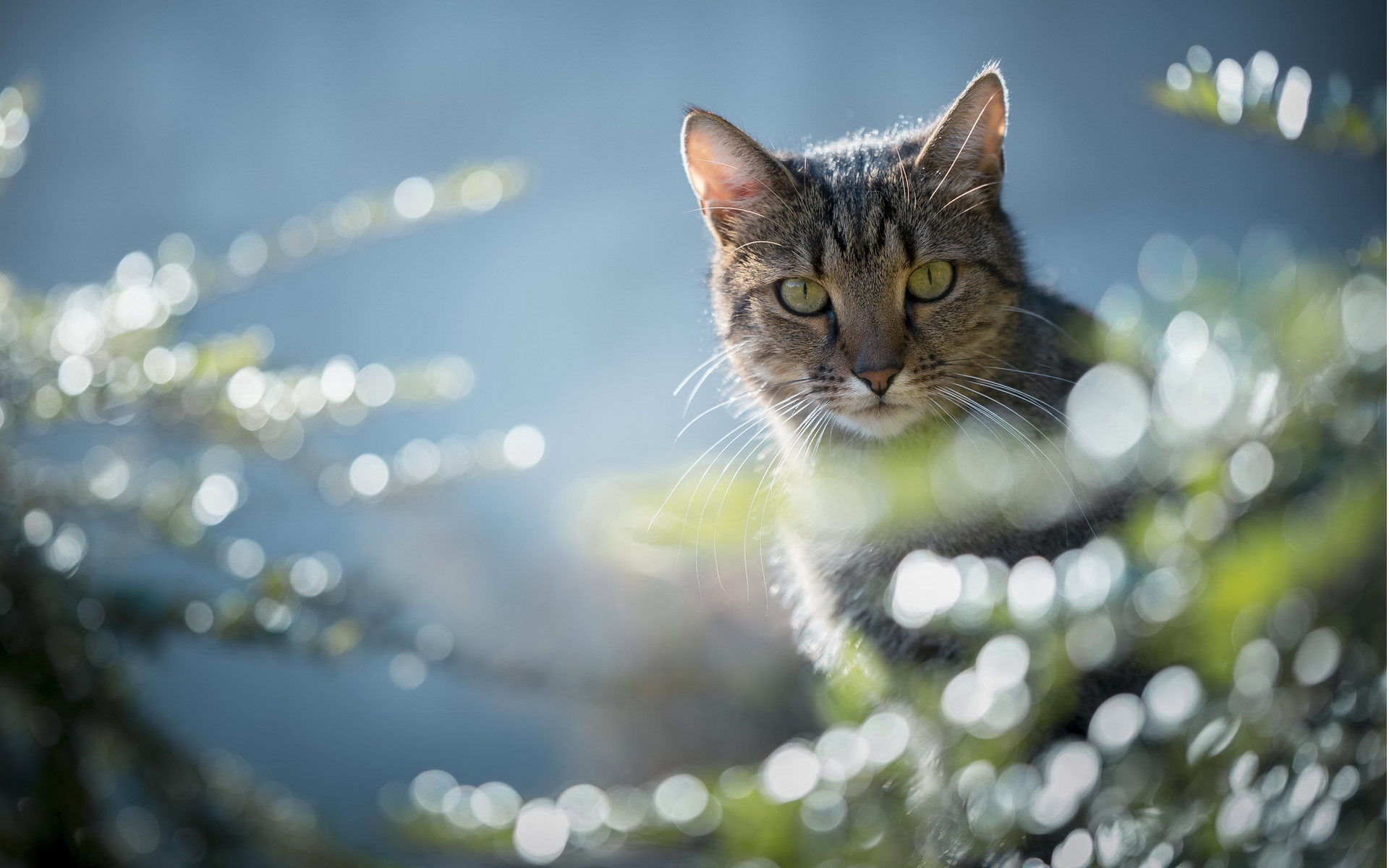 Description: A cat is sitting in a tree looking at something with a blurry background of water droplets on the branches.